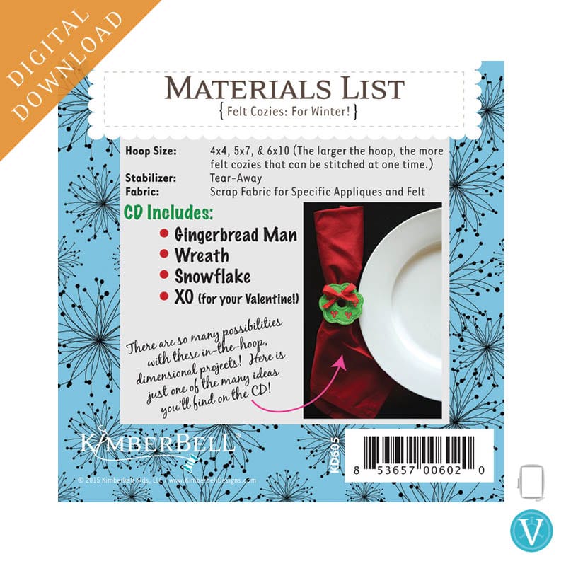 Create quick and simple gifts with Kimberbell Winter Felt Cozies! Made entirely in-the-hoop with Embroidery Felt, Medium Tear-Away, and applique fabric, these darling designs are a go-to for every machine embroiderer. Make one cozy in a 4×4 hoop (or several at once in a larger hoop), then slip over suckers and straws, pencils and more! From class gifts to party favors, Winter Felt Cozies are an easy way to brighten a day!
