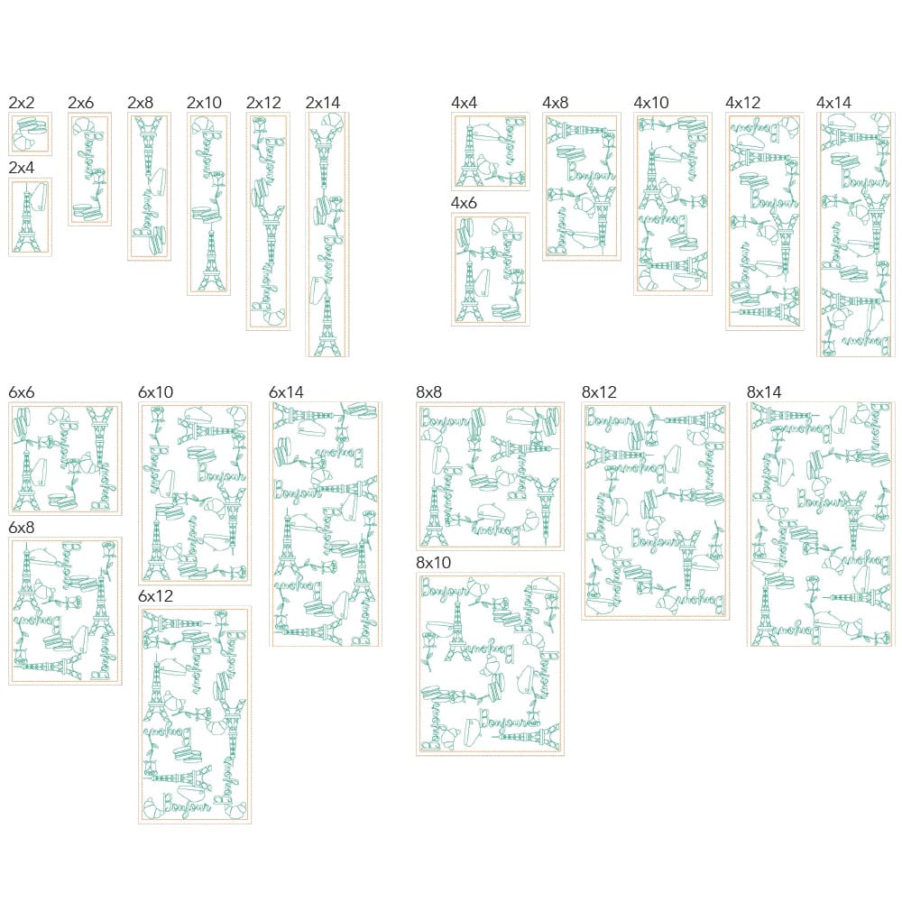 Again, your purchase of France 1 includes 44 file sizes: 22 files for the Clear Blue Tiles ® quilting method and 22 files for the Block-by-Block quilting method. Files will fit within any size of machine embroidery hoop, from 4×4 up to 9×14!