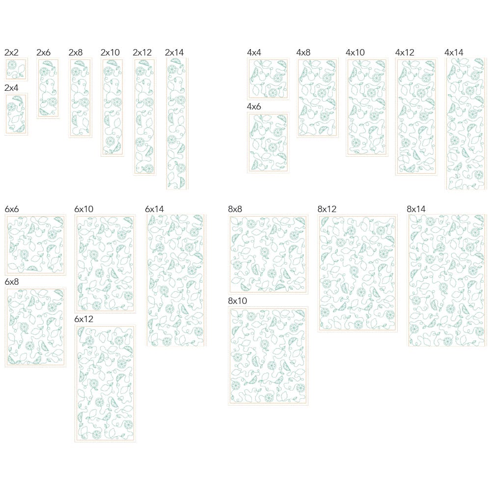 Again, your purchase of Fruit 1 includes 44 file sizes: 22 files for the Clear Blue Tiles ® quilting method and 22 files for the Block-by-Block quilting method. Files will fit within any size of machine embroidery hoop, from 4×4 up to 9×14!