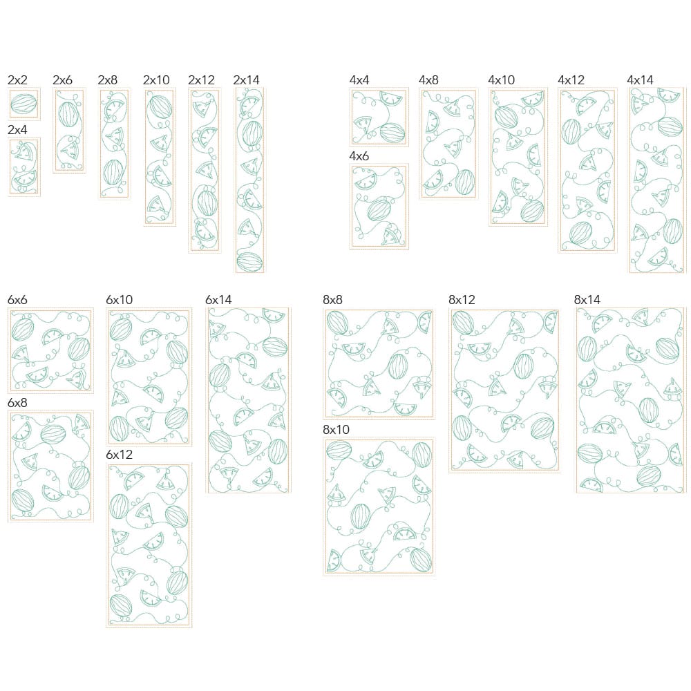 Again, your purchase of Fruit 7 includes 44 file sizes: 22 files for the Clear Blue Tiles ® quilting method and 22 files for the Block-by-Block quilting method. Files will fit within any size of machine embroidery hoop, from 4×4 up to 9×14!