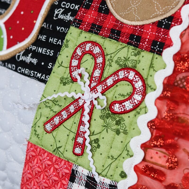 Ginger’s Kitchen is “baking spirits bright” with jolly gingerbread and Christmas confections! Add ribbons and bows to the cookies, then cap gingerbread houses with applique glitter. Lollipops feature a yo-yo technique and mylar brings sparkle to striped candy canes! With ruffles and rick-rack and peppermint pinwheels, this pillow is a tasteful tribute to holiday baking.