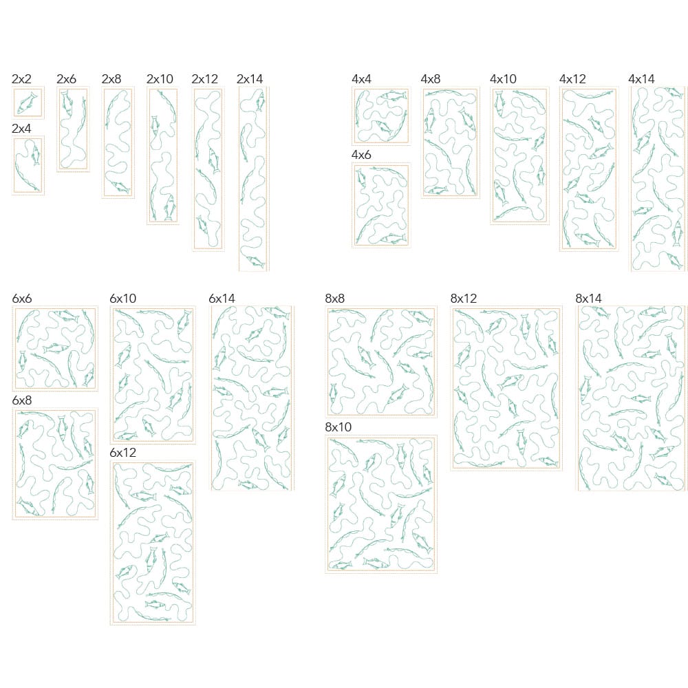 Again, your purchase of Hobby 4 includes 44 file sizes: 22 files for the Clear Blue Tiles ® quilting method and 22 files for the Block-by-Block quilting method. Files will fit within any size of machine embroidery hoop, from 4×4 up to 9×14!