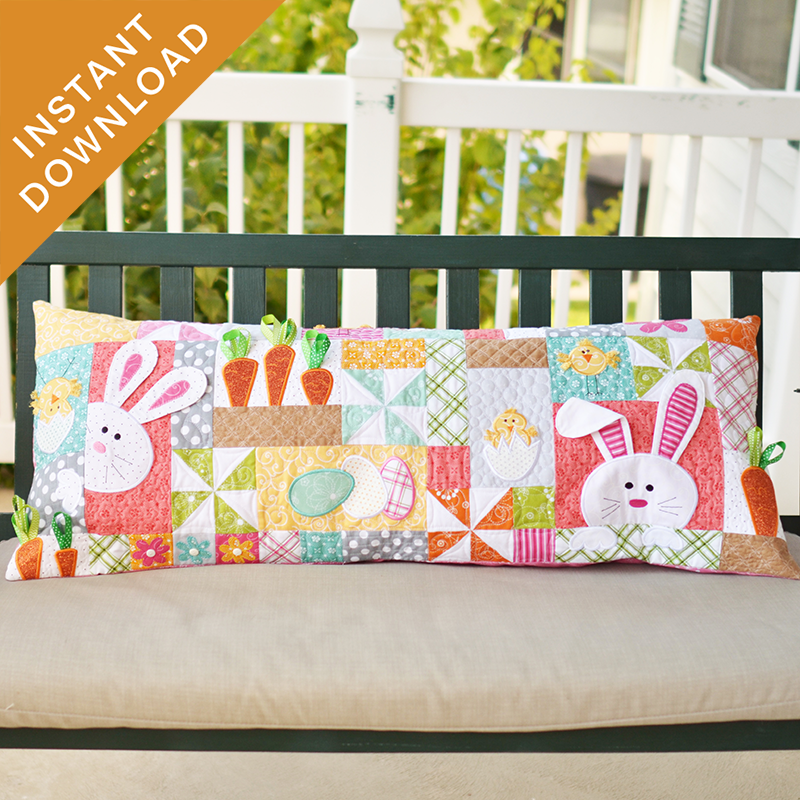 Hoppy Easter is a joyful parade of peek-a-boo bunnies, downy chicks, and darling dimensional elements! Applique carrots have looped ribbon tops and just-hatched chicks have fluffy fringed wings. Add applique eggs, beautiful blooms, and pinwheel blocks (pieced right in-the-hoop)! From floppy ears to fabulous colors, this popular pillow is spring decor to delight your heart.