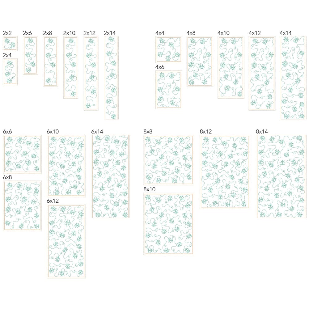 Again, your purchase of Insect 4 includes 44 file sizes: 22 files for the Clear Blue Tiles ® quilting method and 22 files for the Block-by-Block quilting method. Files will fit within any size of machine embroidery hoop, from 4×4 up to 9×14!