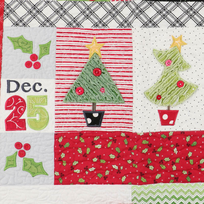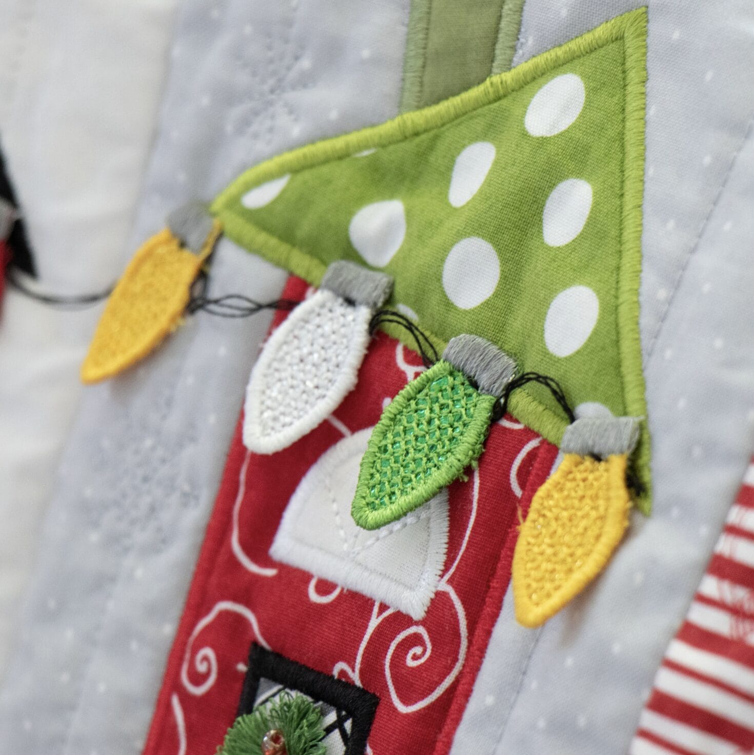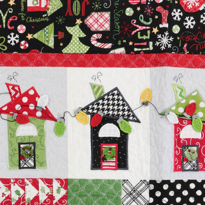 Jingle All the Way is a patchwork quilt of Christmas surprises! Mylar lights line the rooftops of applique houses, while fringed wreaths adorn every door. Create four charming snow globes with clear vinyl “glass” and sequin “snow,” and stitch Christmas trees with fluffy chenille! From applique stockings to dimensional bows, this quilt is the merriest way to deck your halls.