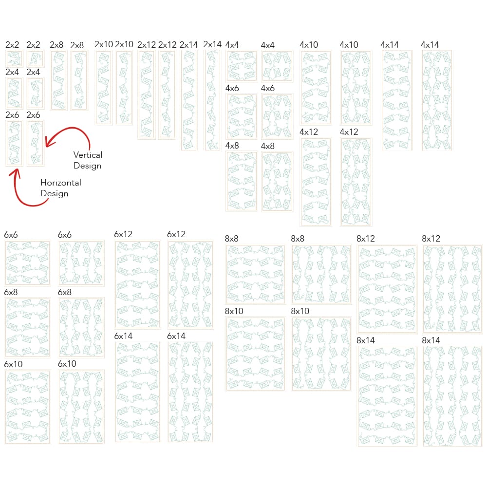 *All 88 files are designed to work with embroidery hoop sizes from 4x4 to 9x14. Check the Embroidery Field Size Chart to double check your machine's capabilities for each file size.