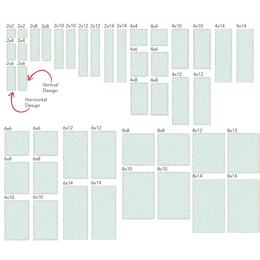 *All 44 files are designed to work with embroidery hoop sizes from 4x4 to 9x14. Check the Embroidery Field Size Chart to double check your machine's capabilities for each file size.