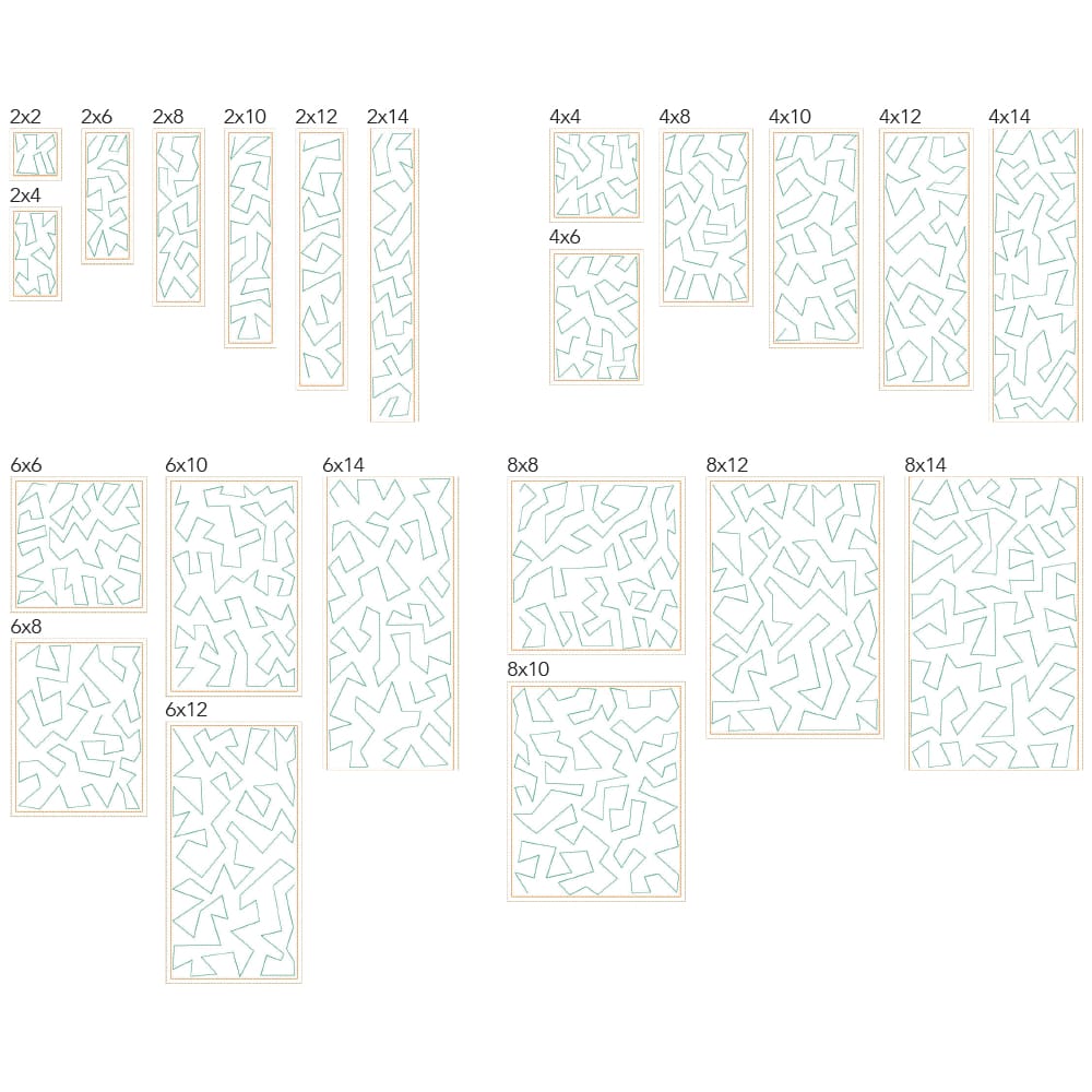 Again, your purchase of Zigzag 1 includes 44 file sizes: 22 files for the Clear Blue Tiles ® quilting method and 22 files for the Block-by-Block quilting method. Files will fit within any size of machine embroidery hoop, from 4×4 up to 9×14!