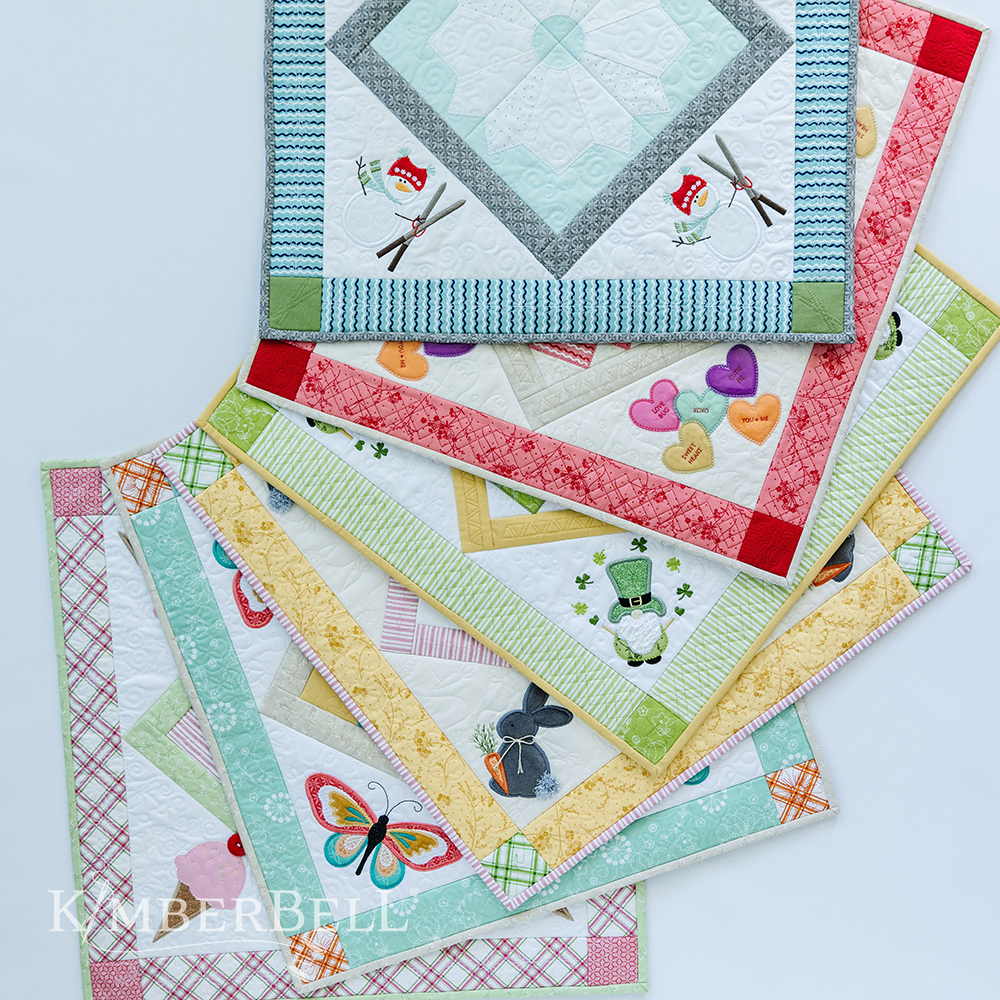 Enjoy seasonal smiles with Kimberbell Cuties, Vol. 2: January-June! These quilted table toppers celebrate the first half of the year with pieced blocks and darling designs. Stitch a beautiful themed pattern in the center square, then frame with adorable snowmen, conversation hearts, leprechauns, and more! Each 22 x 22” table topper features a variety of embellishments, coordinating block-by-block and border quilting designs, and 2” Bitty Blocks for the corners. (Quilting sold separately.) Made in 5×7 (or larger) hoops, Kimberbell Cuties are a festive way to brighten each day!
