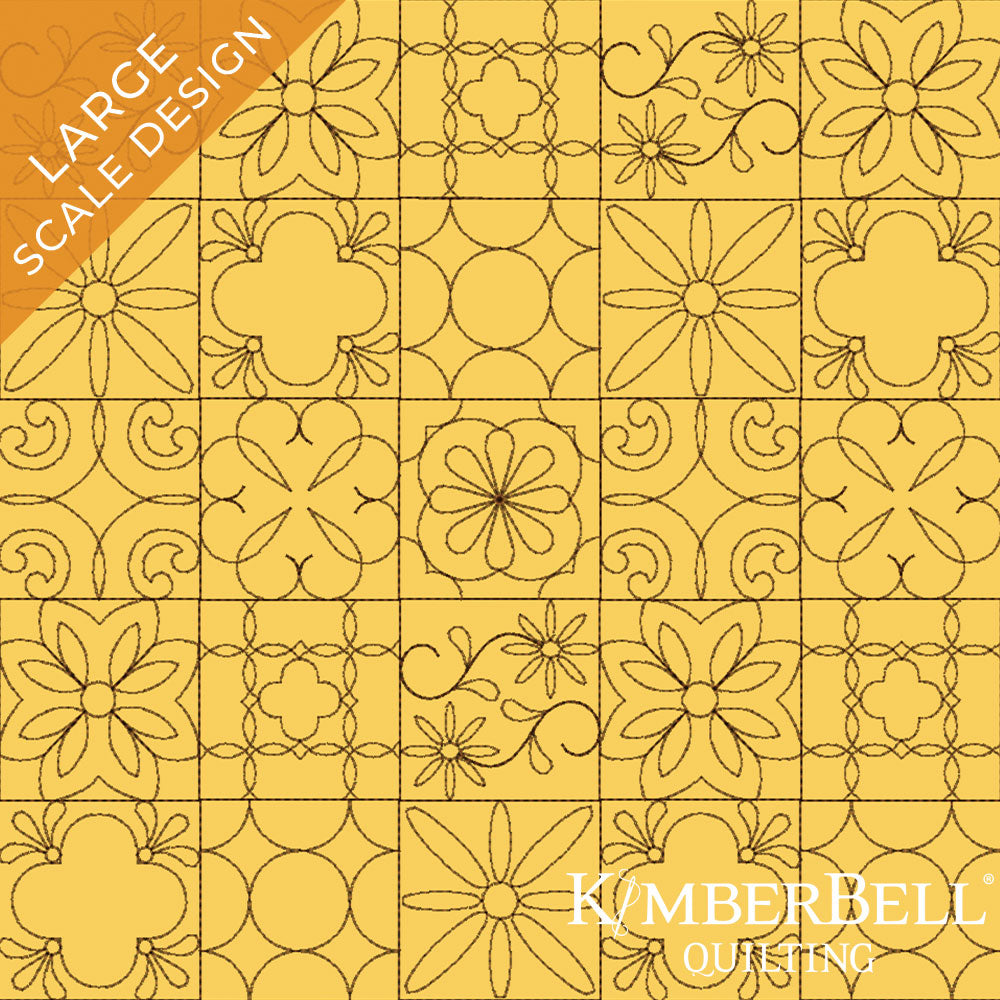 Our Tile 1 Background Quilting is available to use on your embroidery machine to quilt your next project with Kimberbell’s innovative Block-by-Block quilting method. The Block-by-Block quilting method eliminates batting/bulk in the seams when sewing blocks together. Because of travel lines, this design will NOT work with Clear Blue Tiles ®. With large-scale design elements, this design is ideal for use on larger projects for a quicker stitchout and project finish time.