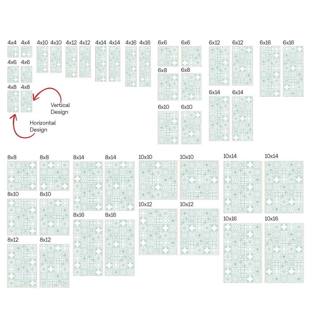 *All 44 files are designed to work with embroidery hoop sizes from 5x7 to 10x16. Check the Embroidery Field Size Chart to double check your machine's capabilities for each file size.