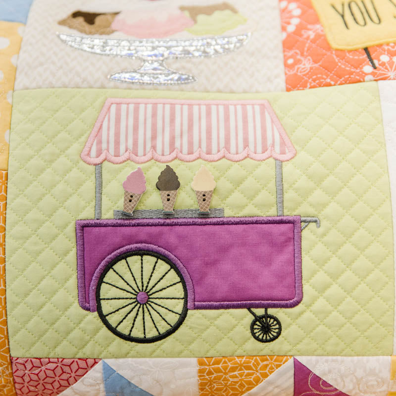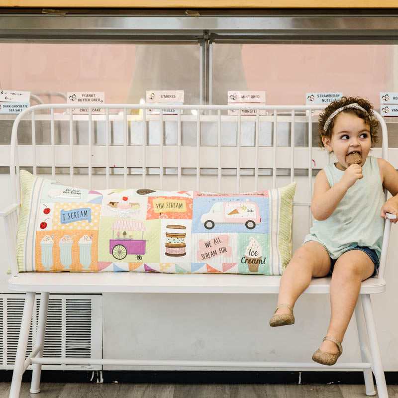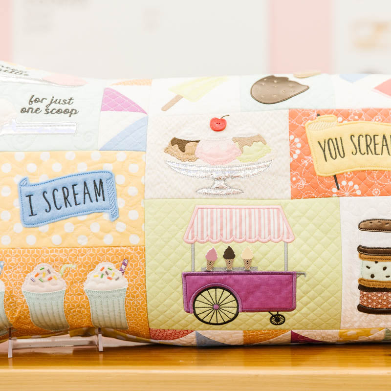 Two Scoops celebrates the sweetness of summer with your favorite frozen desserts! Enjoy ice cream sandwiches, dipped bars, milkshakes, and more, all served with a smile from the applique cart and truck. With craveable colors and delectable embellishments, Kimberbell’s Two Scoops Bench Pillow is a real treat for every machine embroidery enthusiast.