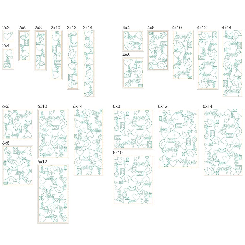 Again, your purchase of Valentine 2 includes 44 file sizes: 22 files for the Clear Blue Tiles ® quilting method and 22 files for the Block-by-Block quilting method. Files will fit within any size of machine embroidery hoop, from 4×4 up to 9×14!