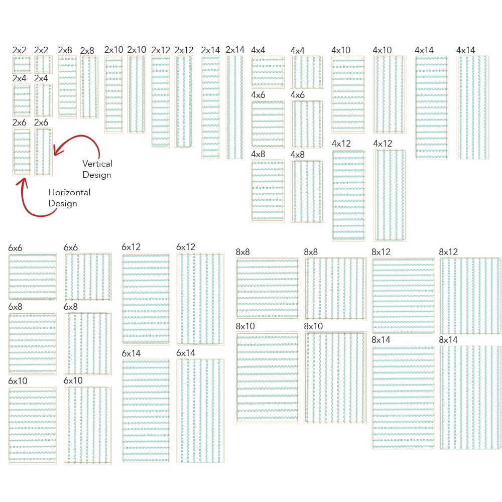 *All 44 files are designed to work with embroidery hoop sizes from 4x4 to 9x14. Check the Embroidery Field Size Chart to double check your machine's capabilities for each file size.