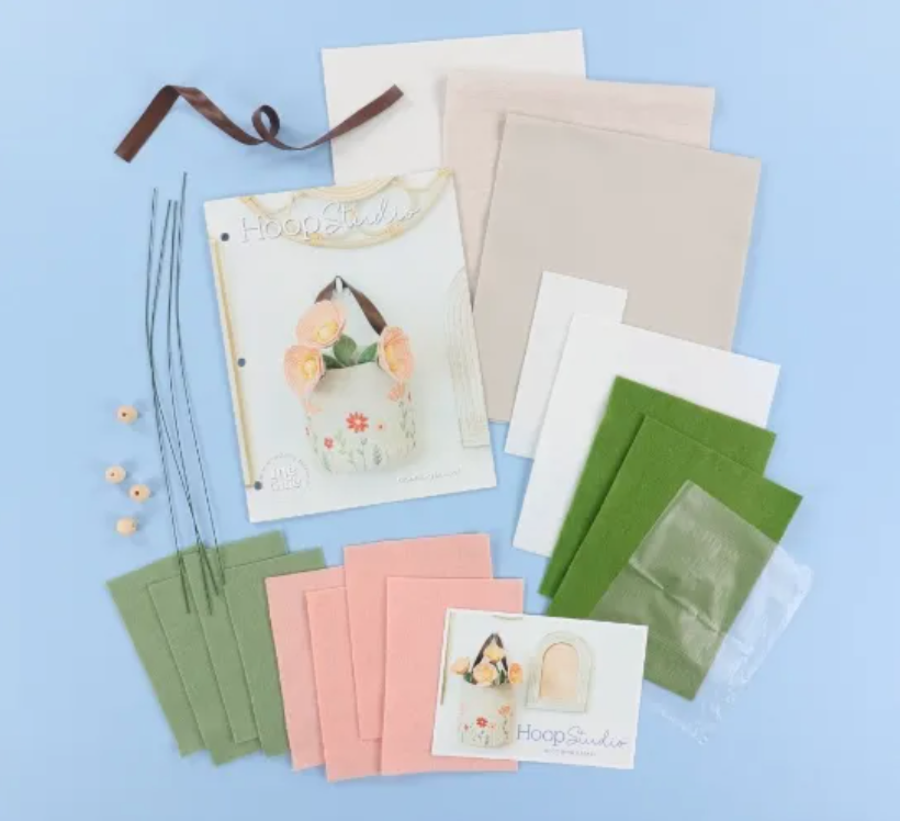 Create a lovely Blooming Basket on your embroidery and sewing machine! Your April Hoop Studio box includes everything you need for your project, including Shape Form Interfacing, beautiful fabric, a leather strap, a wooden bead, and so much more. Stitch your basket in a 5x7 or 8x12 hoop, then make four dimensional felt flowers with textured petals and leaves!