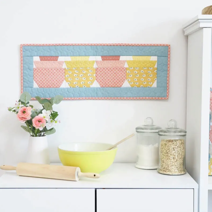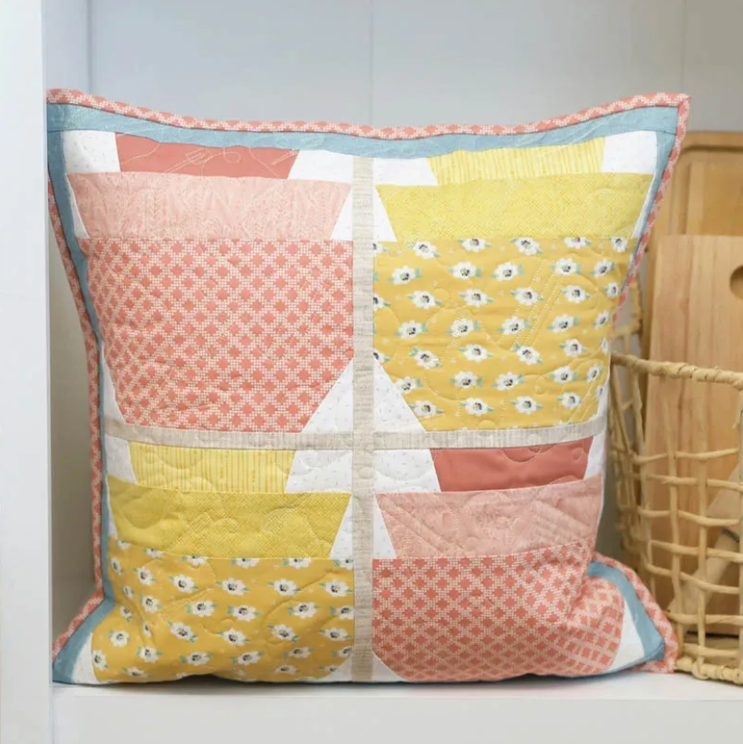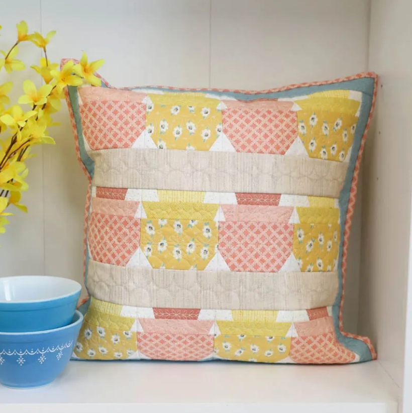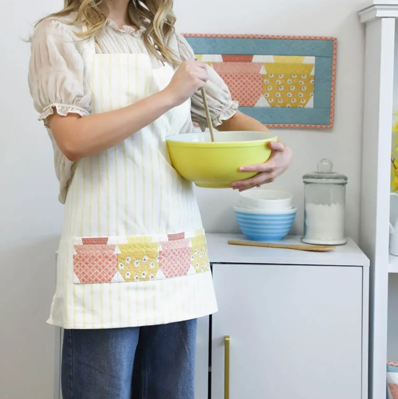 Create unique and cheerful decor with the June Perfectly Pieced box! Our Stacked Bowls Block features Lazy Daisy Yellow and Diamonds Coral fabrics from Riley Blake, as well as lovely selections from Art Gallery, Benartex, Dear Stella, FIGO Fabrics, Poppie Cotton, and Windham Fabrics. Follow our full-color, step-by-step instructions to create pillows, wall hangings, and table runners, and don’t miss our special Yellow Pinstripe Apron project with four Stacked Bowl blocks on the front pockets!