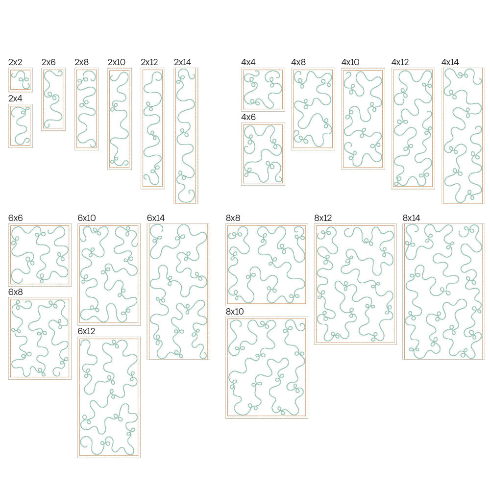 *All 22 files are designed to work with embroidery hoop sizes from 4x4 to 9x14. Check the Embroidery Field Size Chart to double check your machine's capabilities for each file size.