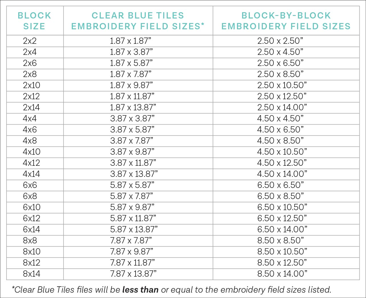 22 file sizes for Clear Blue Tiles quilting (compatible with Clear Blue Tiles (Expansion Set, and Essentials Set tiles 2×2 and bigger)