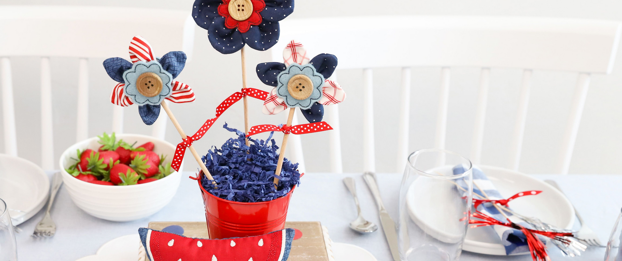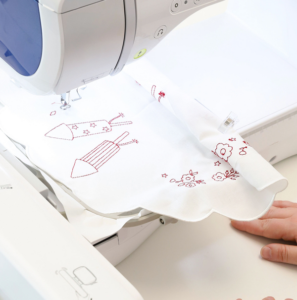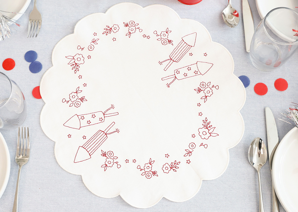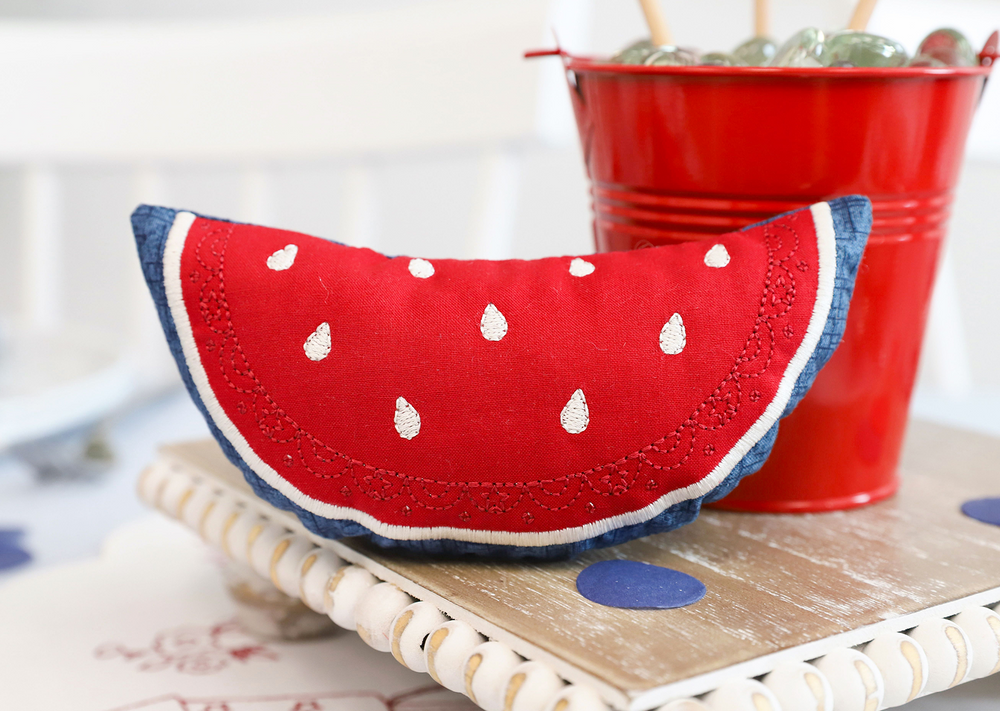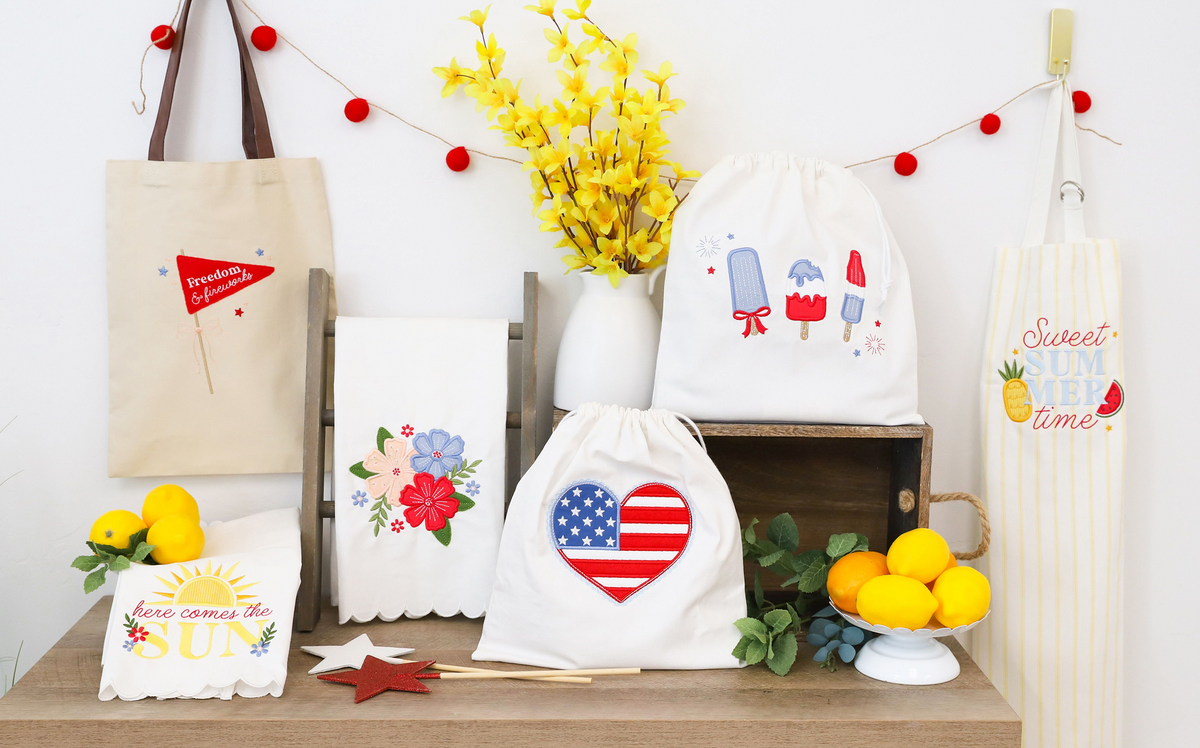 Make a festive table display with five darling designs! Stitch the Redwork Table Round, then place it beneath the included table riser and red pail. The Patriotic Posy and two Starry Blossoms are a fantastic floral centerpiece and the Summer Slice Stuffie is the perfect finishing touch! With new blanks and charming accessories, Patriotic Parade is a sweet celebration for every hometown heart.