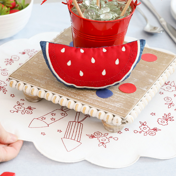 Make a festive table display with five darling designs! Stitch the Redwork Table Round, then place it beneath the included table riser and red pail. The Patriotic Posy and two Starry Blossoms are a fantastic floral centerpiece and the Summer Slice Stuffie is the perfect finishing touch! With new blanks and charming accessories, Patriotic Parade is a sweet celebration for every hometown heart.
