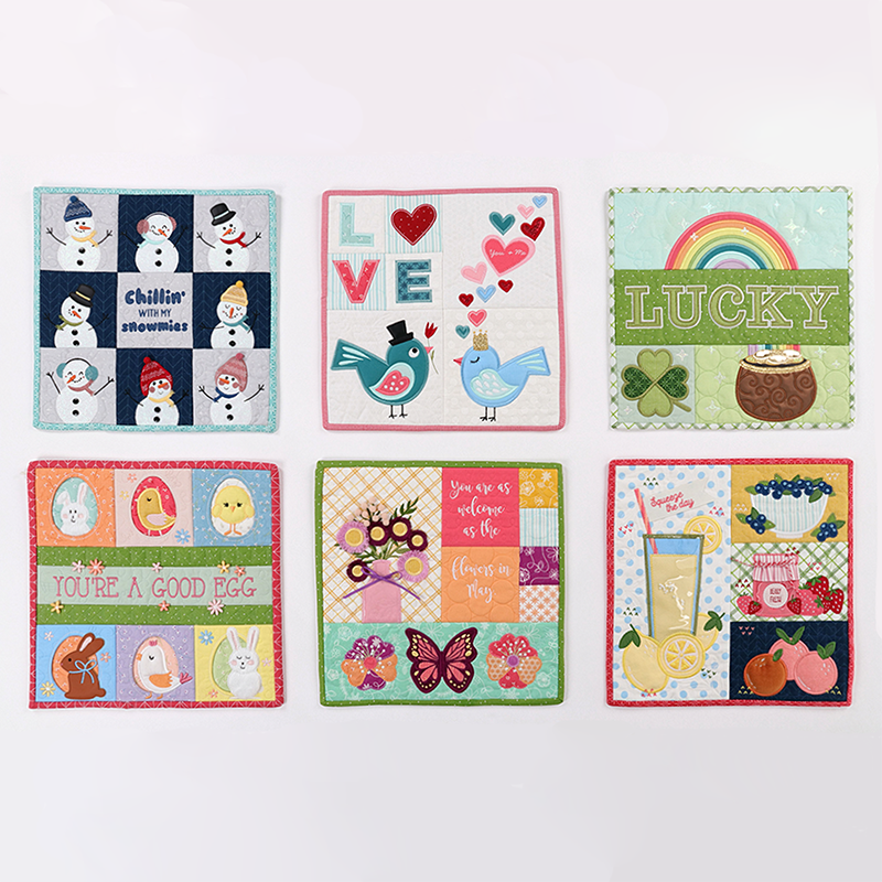 Mini Quilts, Vol. 1: January-June celebrates the first half of the year with beautiful blocks and darling designs. Stitch each block on your embroidery machine, add optional background quilting*, and sew the blocks together on your sewing machine! From snowmen and shamrocks to lovebirds and more, Kimberbell Mini Quilts are perfect for gifts and decor.