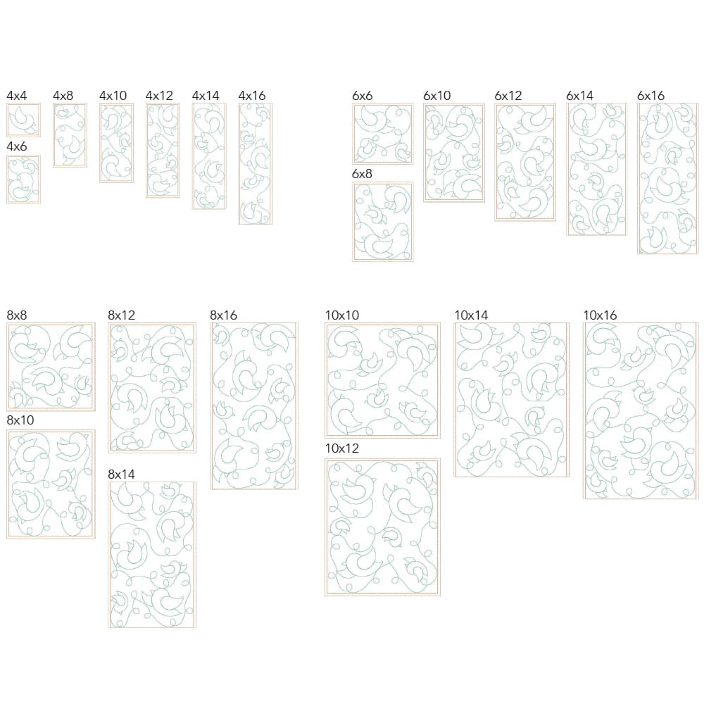 Again, your purchase of the large-scale Animal 17 design includes 44 file sizes: 22 files for the Clear Blue Tiles quilting method and 22 files for the Block-by-Block quilting method. These large-scale design files fit within machine embroidery hoop sizes 4×4 to 10×16!