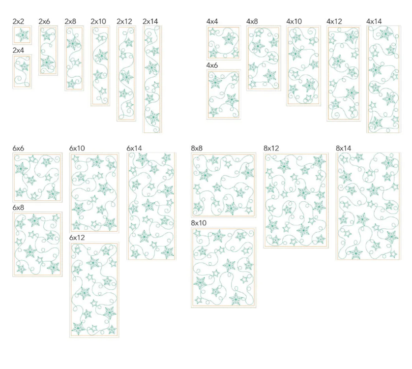 This design is compatible with the following hoop sizes: 5x7, 6x10, 8x12