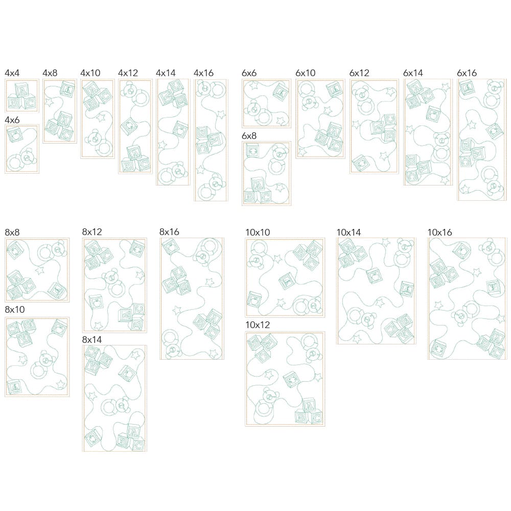 Again, your purchase of the large-scale Baby 2 design includes 44 file sizes: 22 files for the Clear Blue Tiles quilting method and 22 files for the Block-by-Block quilting method. These large-scale design files fit within machine embroidery hoop sizes 4×4 to 10×16!