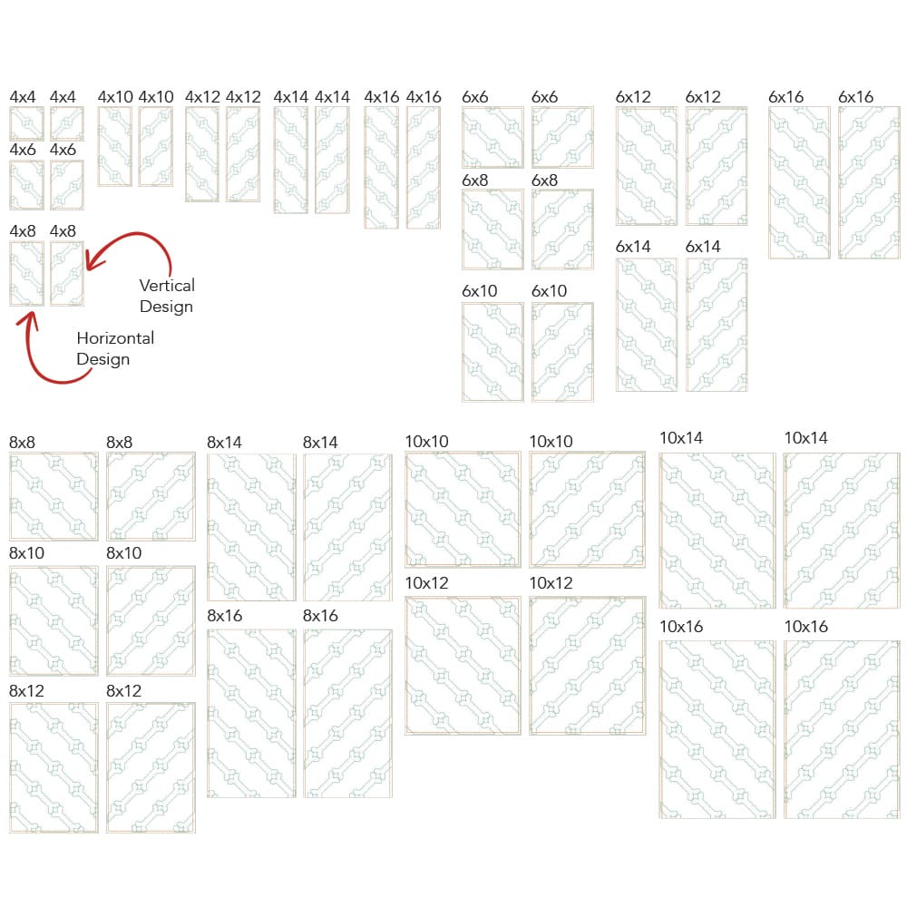 Again, your purchase of the large-scale Bone 1 design includes 44 file sizes: 44 files for the Block-by-Block quilting method. These large-scale design files fit within machine embroidery hoop sizes 4×4 to 10×16!