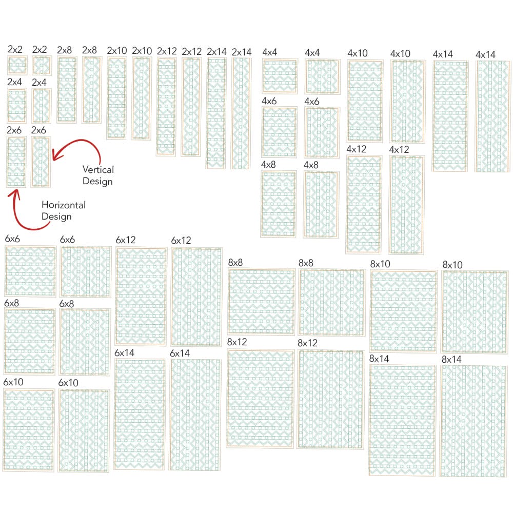*All 44 files are designed to work with embroidery hoop sizes from 4x4 to 9x14. Check the Embroidery Field Size Chart to double check your machine's capabilities for each file size.