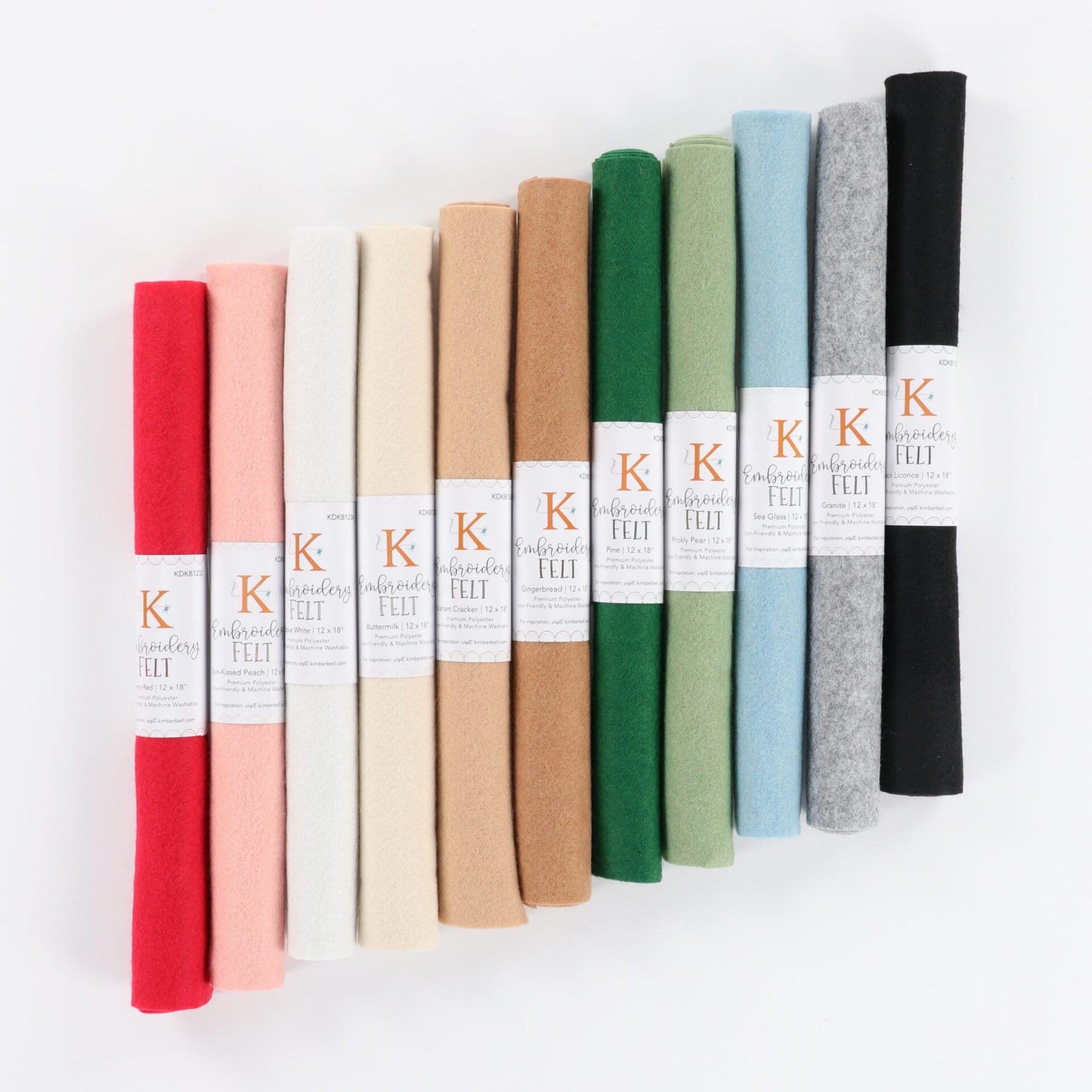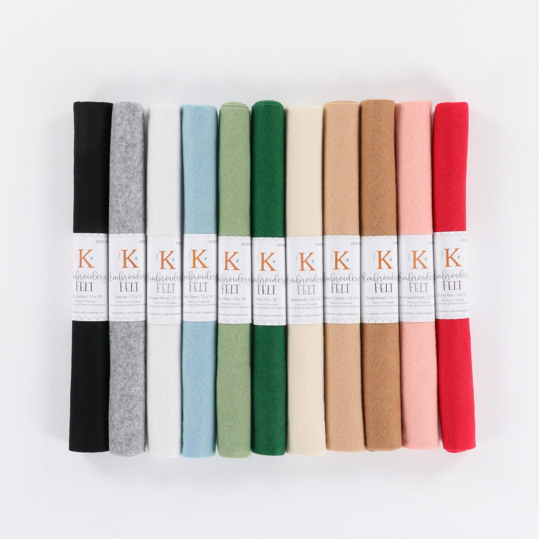 Soft and fun to stitch, our premium Embroidery Felt comes in a variety of beautiful colors, including Graham Cracker, Sun-Kissed Peach, Sea Glass, Pine, Buttermilk, Antique White, Cherry Red, Gingerbread, Prickly Pear, Black Licorice, and Granite. Available as a 12 x 18” sheet, Embroidery Felt is ideal for Noel’s Quilted Stockings, applique embellishments, and other heart “felt” Kimberbell projects!