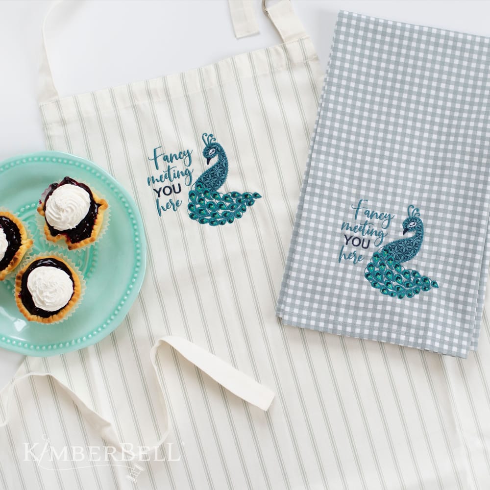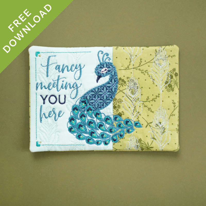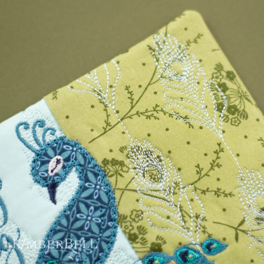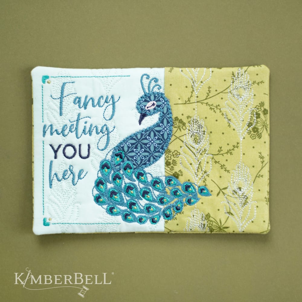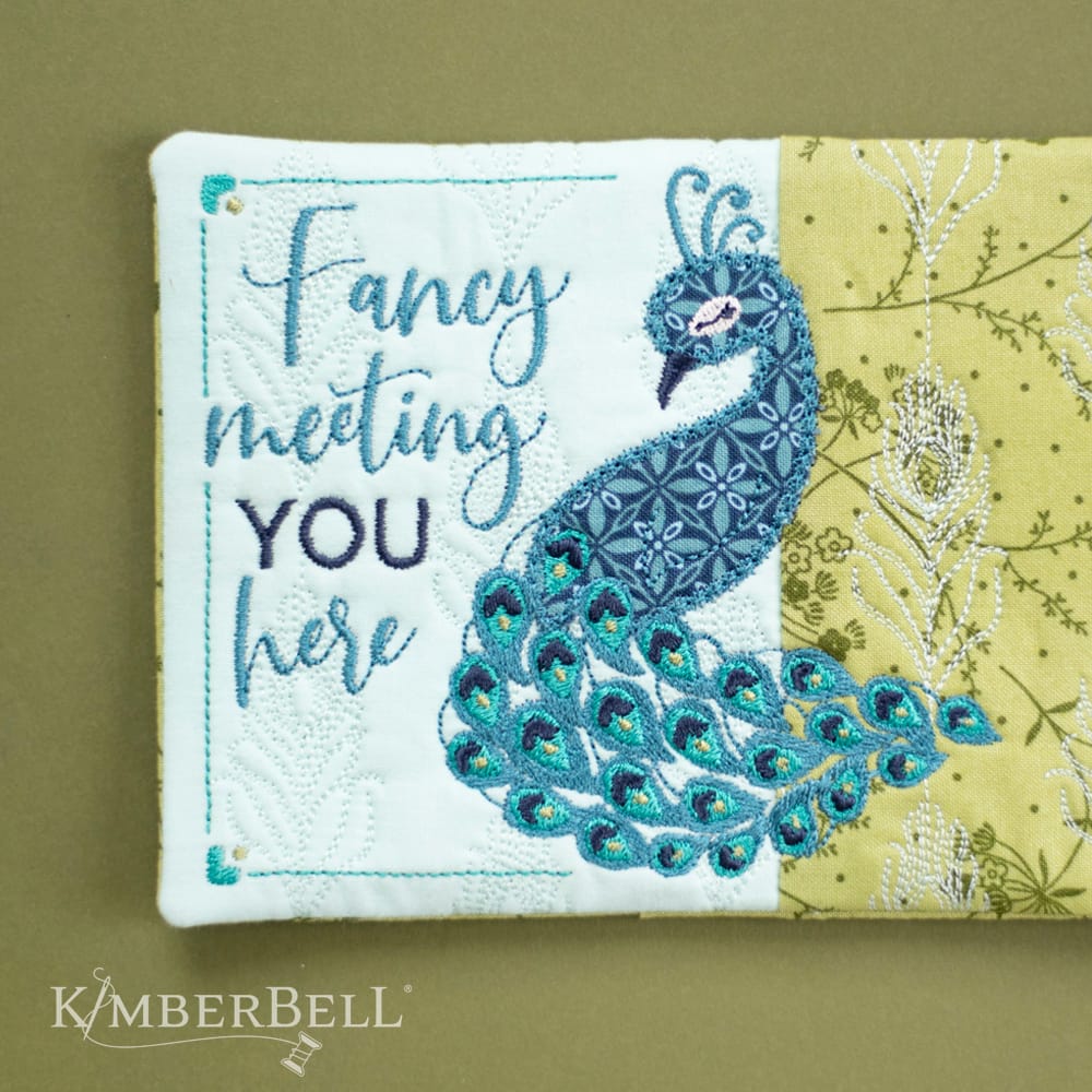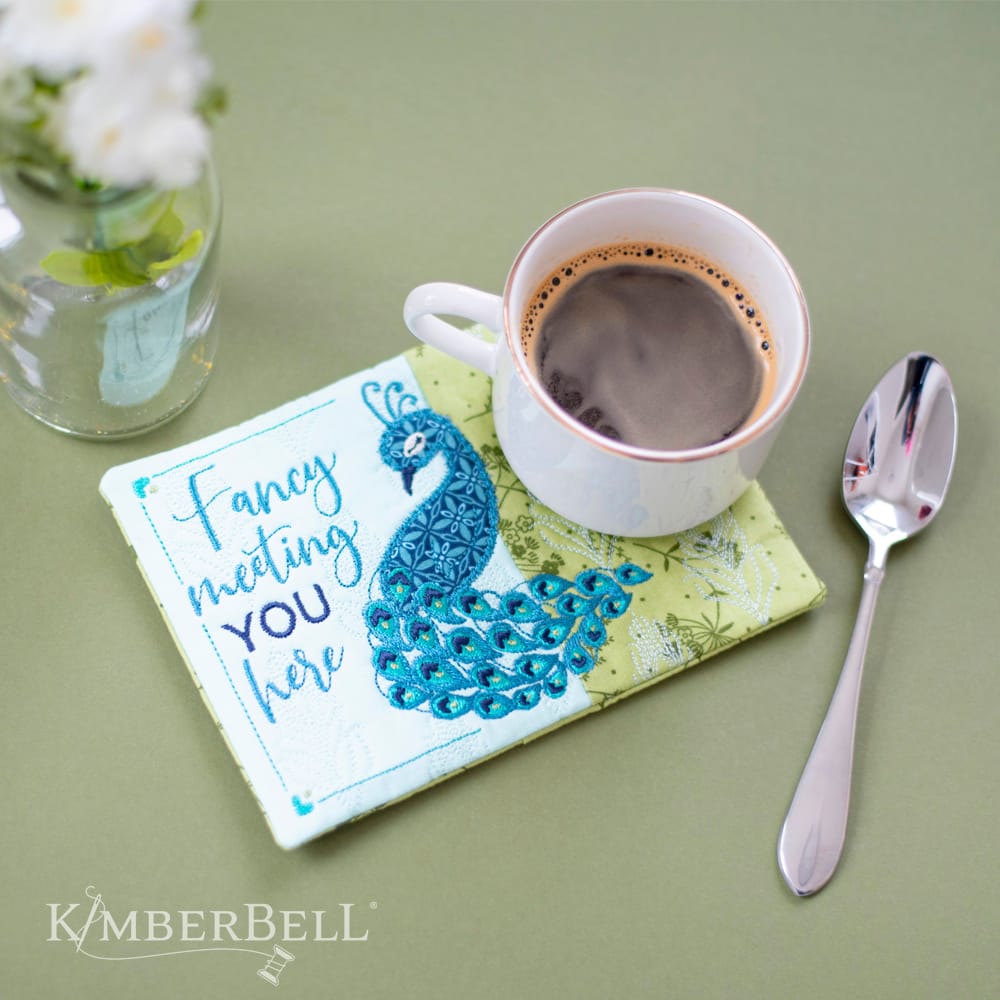 “Fancy Meeting You Here!” Kimberbell’s FREE Mug Rug design is beautifully simple and simply beautiful, with an applique peacock and decorative stitching. Create your Mug Rug in a 5×7 hoop with rich turquoise colors, an elegant border, and a quilted feather background, OR stitch just the peacock and sentiment on a variety of Kimberblanks! (Directions are included for both options.) If you’re looking for a unique gift idea, our Fancy Meeting You Here design is perfect for tea time, party time, or any time you’re feeling just a little…fancy.