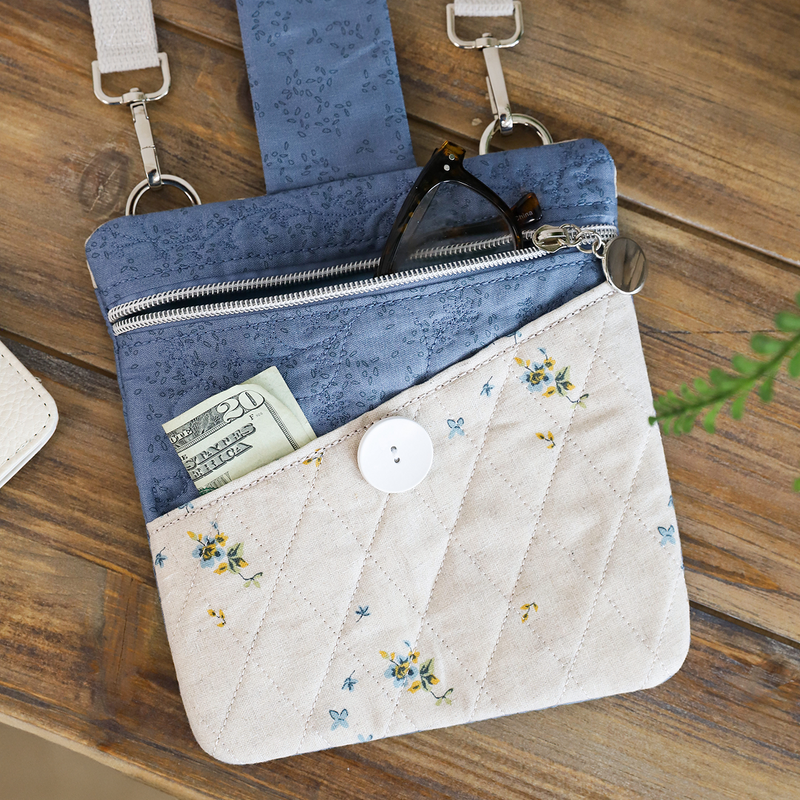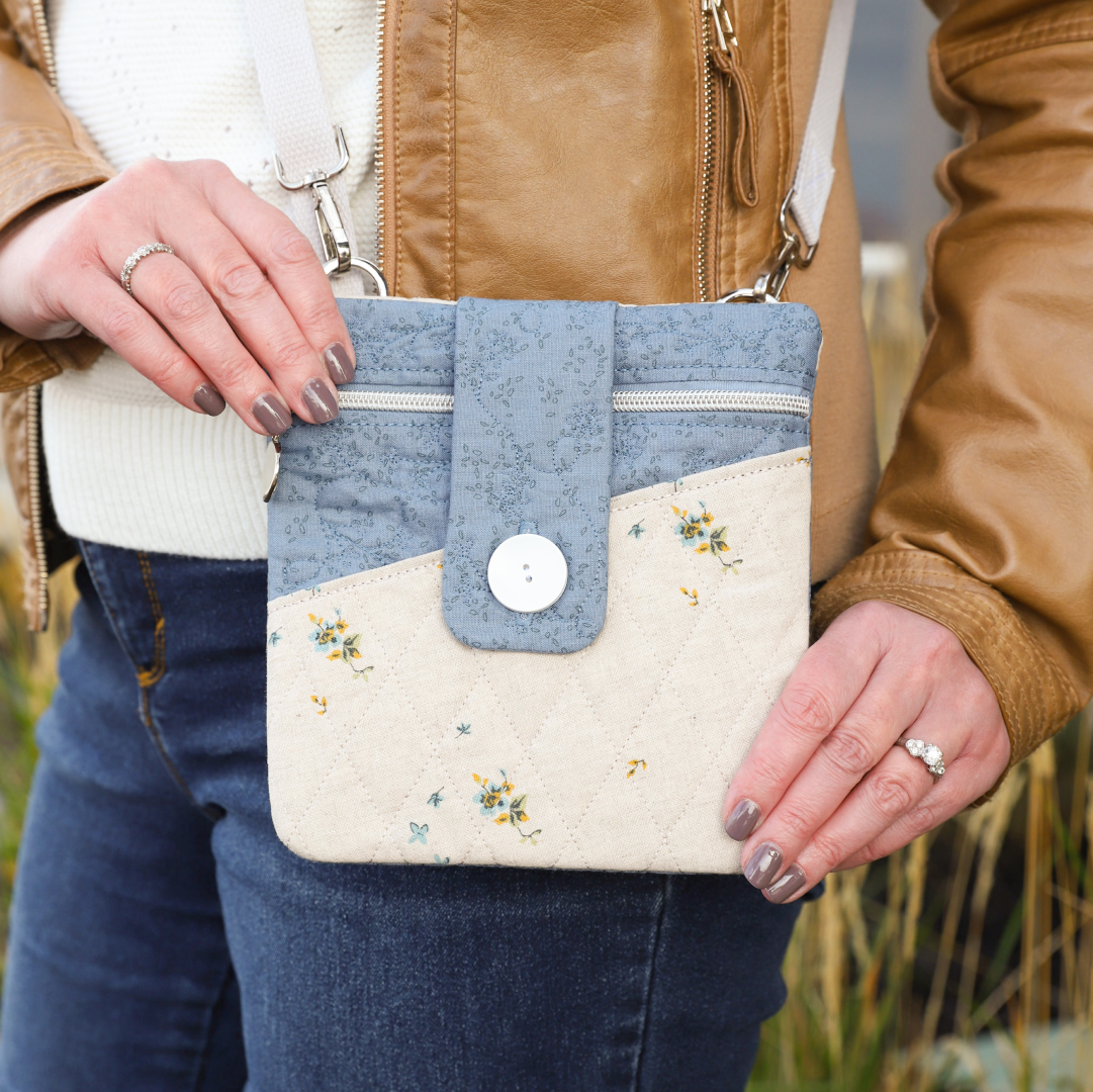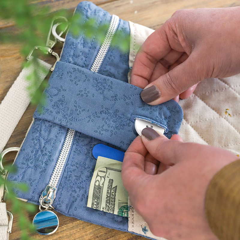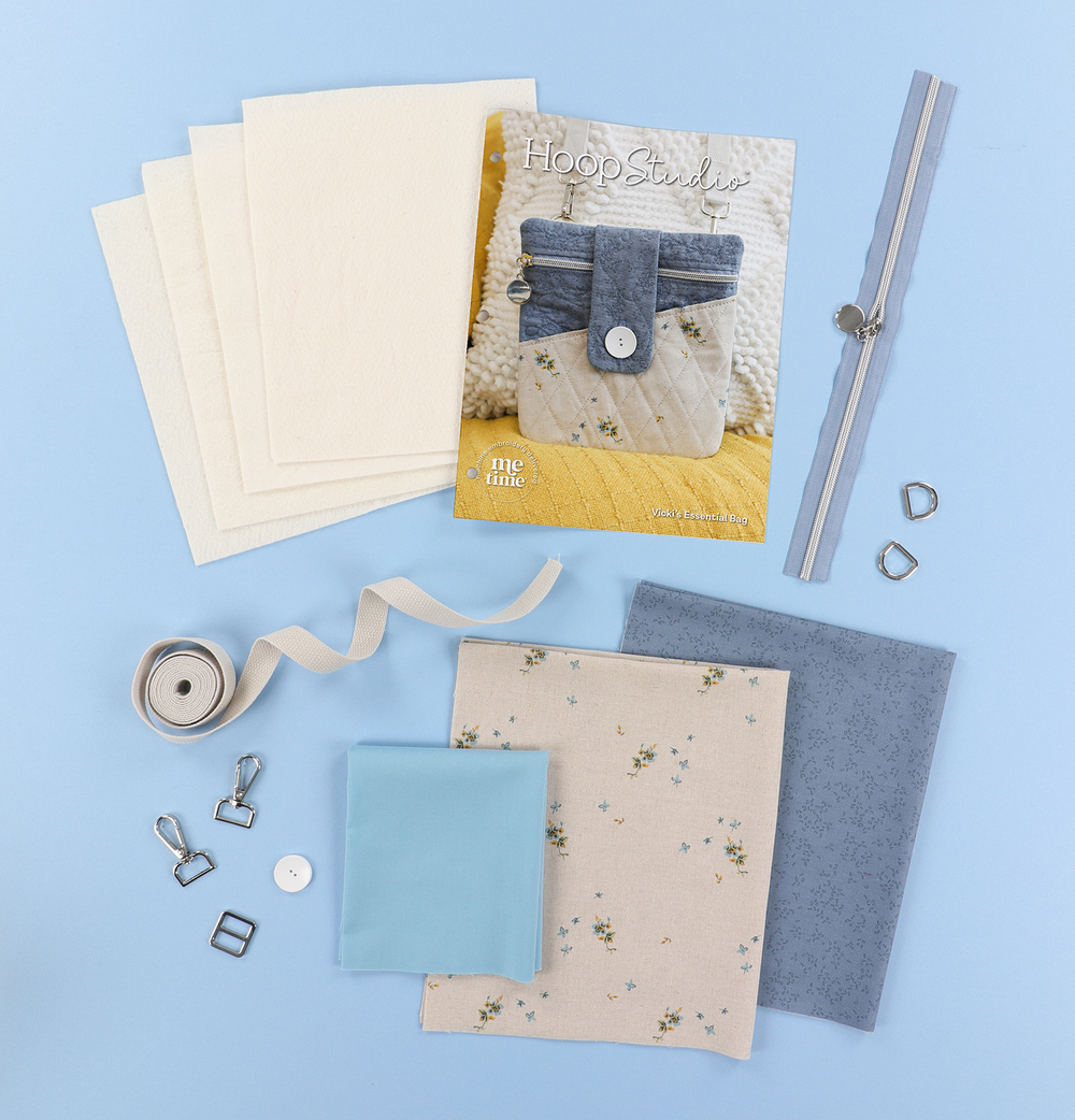 Create functional fashion with Vicki’s Essential Bag! Your February Hoop Studio box includes the supplies you need to make one stylish bag with a diagonal pocket, quilted flap, and zippered enclosure. Stitch the small size in a 5x7 hoop OR the large size in an 8x12 hoop, then add the included hardware and cotton webbing strap! Our detailed instructions and innovative techniques make it easy to finish your bag completely in-the-hoop. With its curated fabrics and darling design, Vicki’s Essential Bag is your grab-and-go accessory for phones, keys, wallets, and more!