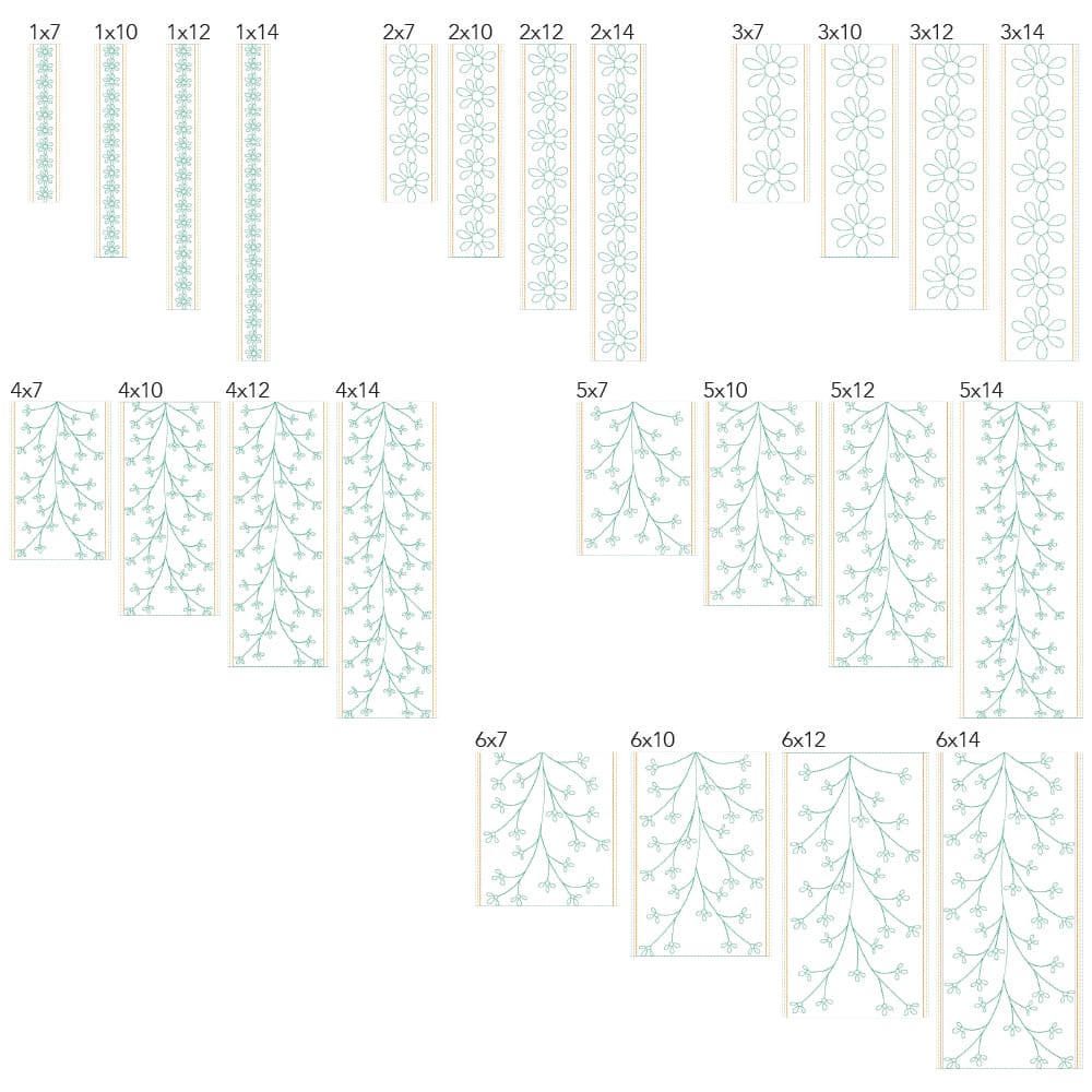 Again, your purchase of Floral Border 1 includes 48 file sizes: 24 files for the Clear Blue Tiles ® quilting method and 24 files for the Block-by-Block quilting method. Files will fit within any size of machine embroidery hoop from 5×7 up to 9×14!