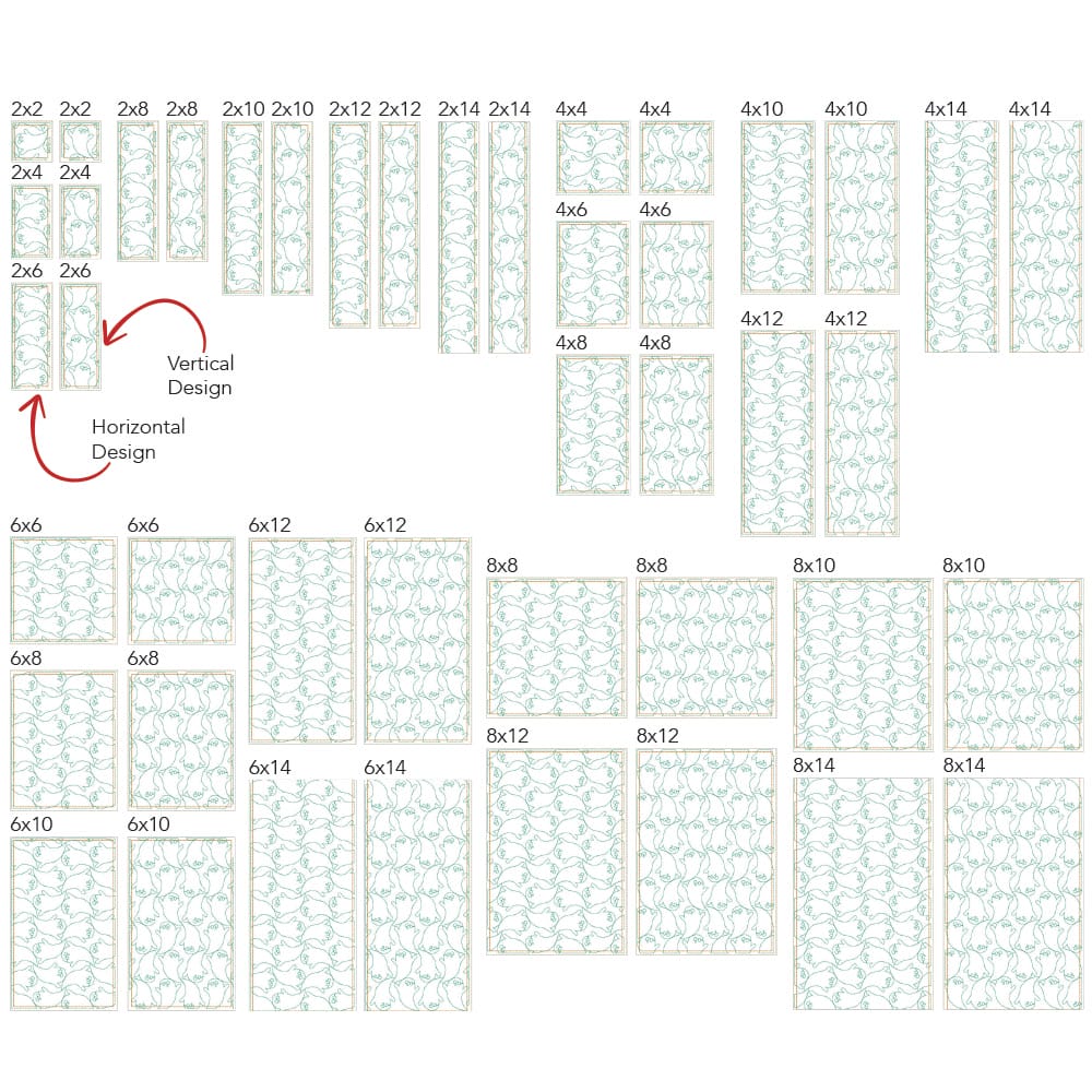 *All 44 files are designed to work with embroidery hoop sizes from 4x4 to 9x14. Check the Embroidery Field Size Chart to double check your machine's capabilities for each file size.