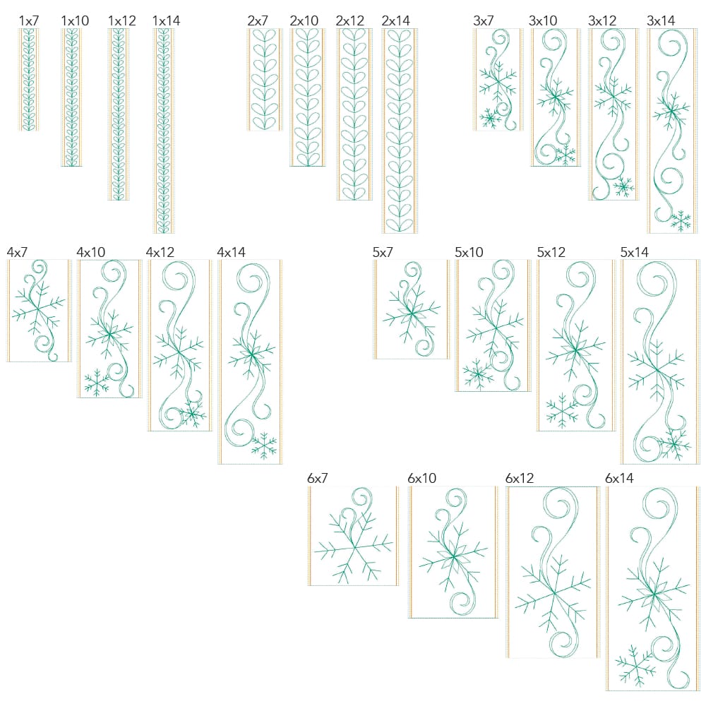 Again, your purchase of Christmas Border 2 includes 48 file sizes: 24 files for the Clear Blue Tiles ® quilting method and 24 files for the Block-by-Block quilting method. Files will fit within any size of machine embroidery hoop from 5×7 up to 9×14!