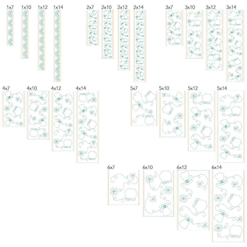 Again, your purchase of St Patricks Border 1 includes 48 file sizes: 24 files for the Clear Blue Tiles ® quilting method and 24 files for the Block-by-Block quilting method. Files will fit within any size of machine embroidery hoop from 5×7 up to 9×14!