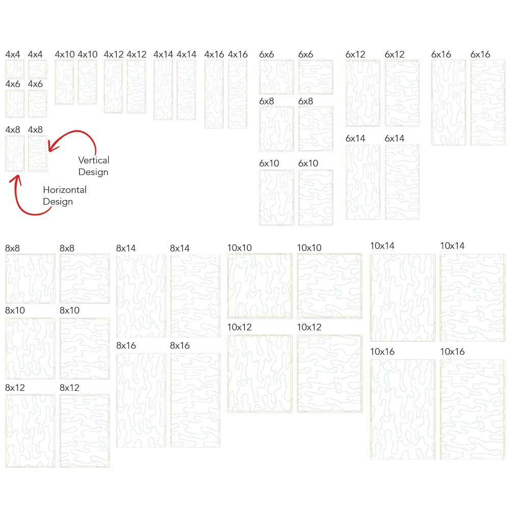 Again, your purchase of the large-scale Liquid 1 design includes 44 file sizes: 44 files for the Block-by-Block quilting method. These large-scale design files fit within machine embroidery hoop sizes 4×4 to 10×16!