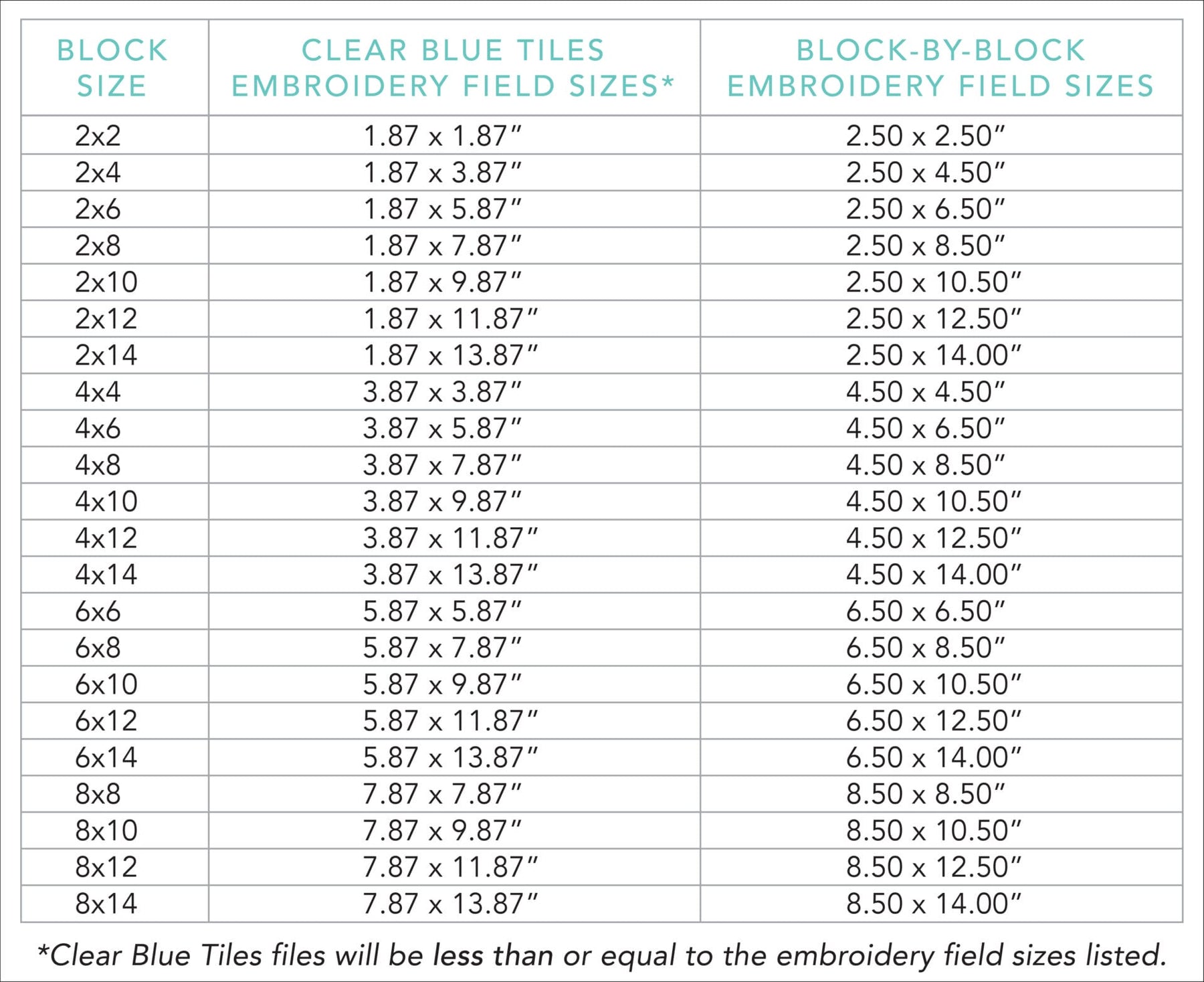 • 22 finished block tile sizes/file sizes for the Clear Blue Tiles ® quilting method AND