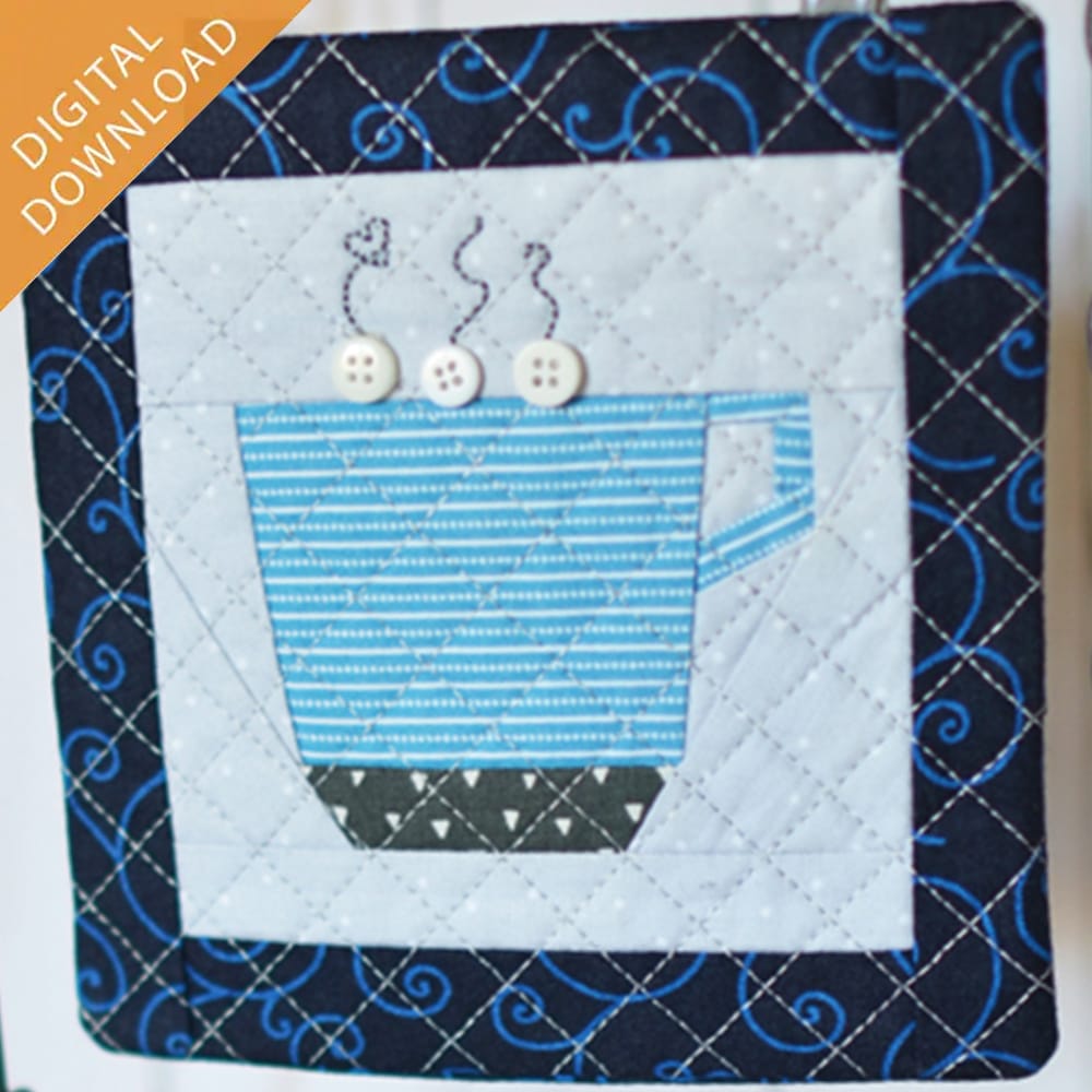 Our Machine Embroider by Number: Mug is pieced entirely in-the-hoop of your embroidery machine. Simply stitch the template on Kimberbell Project Batting and add applique pieces as directed! Available in five graduating sizes, our cozy Mug features optional ribbon loops and dimensional “marshmallow” buttons.