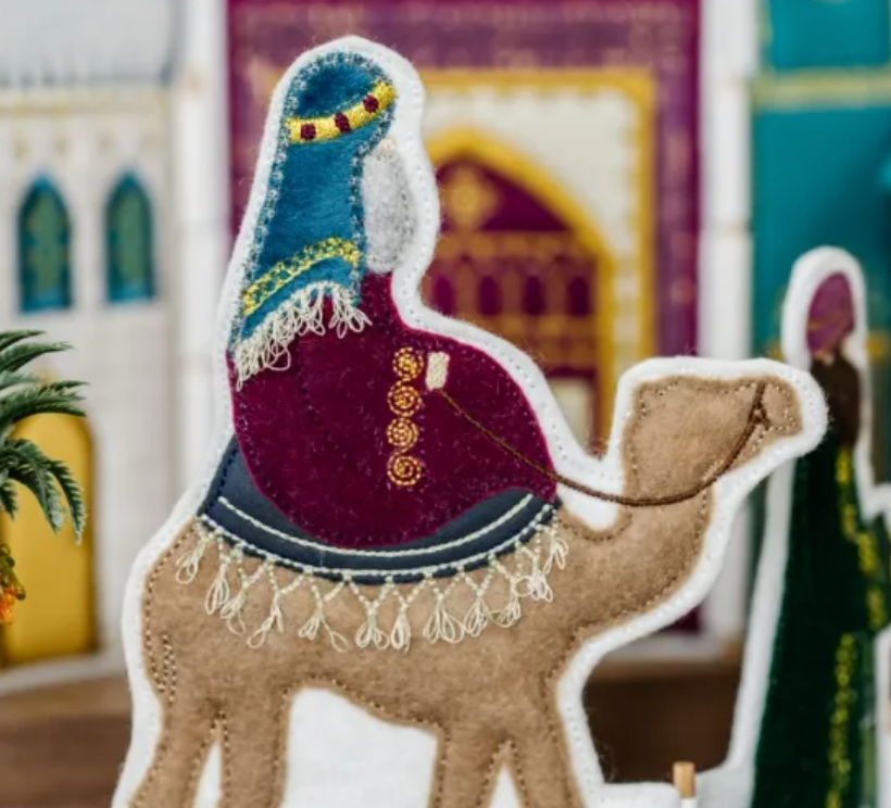 Create three Magi with gifts from afar! Lush Microvelvet, shimmery Mylar, and gold metallic thread add a touch of elegance, while a fringed saddle blanket is a dimensional pop! Make your tri-fold with our in-the-hoop hinge technique.