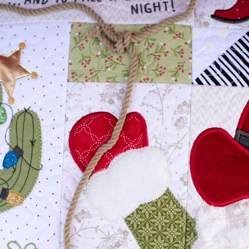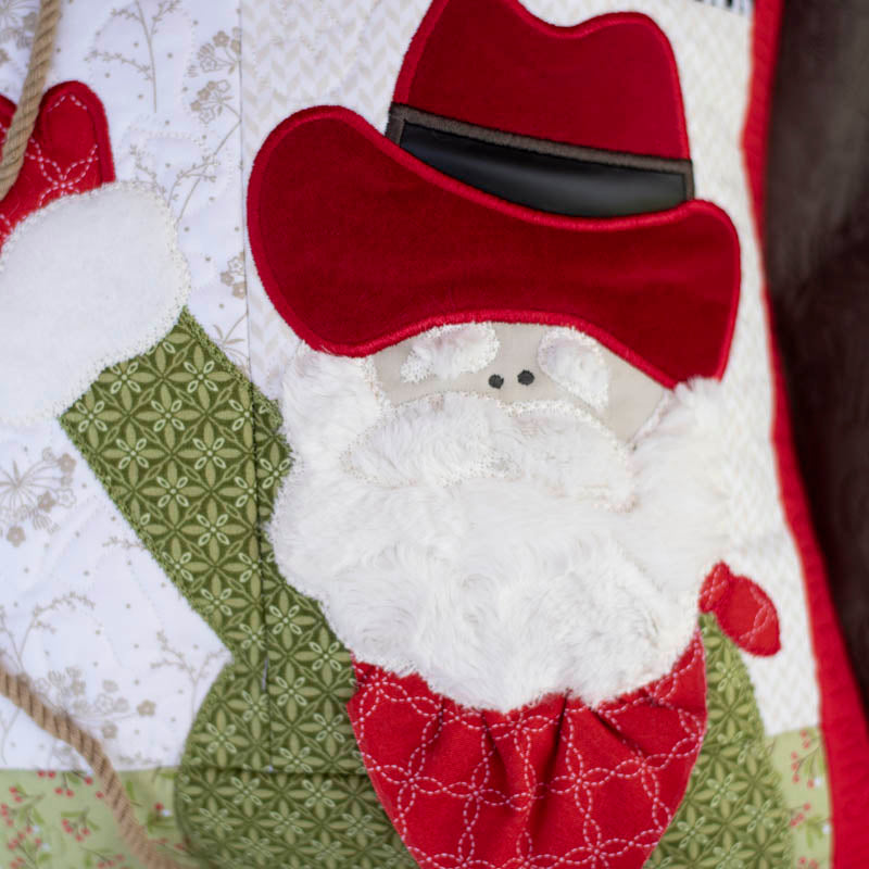 Merry Christmas Y’all will spur your creativity with a cowboy Santa and a roundup of embellishments! This 22 x 22” pillow is inspired by Kimberbell’s classic wall hanging and features cowboy boots, a lassoed sentiment, and a saguaro tree topped with a bright sheriff’s star. With optional background quilting and dimensional details, we reckon this pillow is a holiday hoot!*