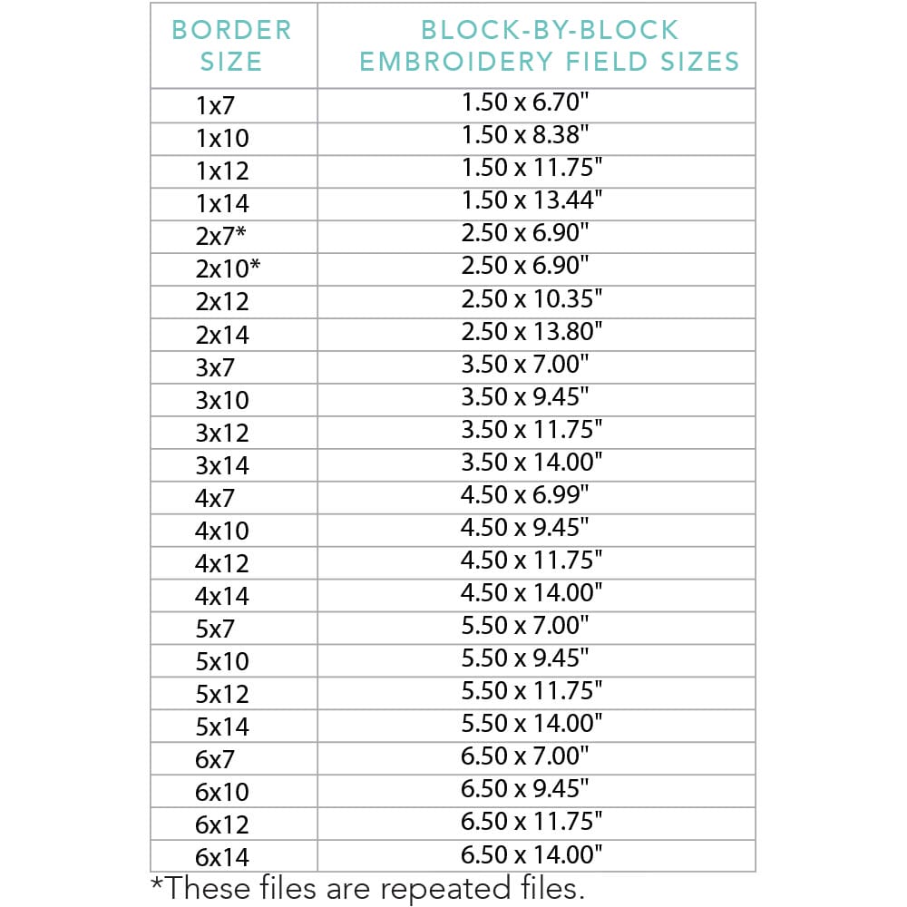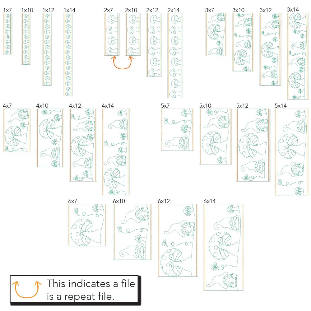 Again, your purchase of Mushroom Border 1 includes 24 file sizes for the Block-by-Block quilting method, including 1 repeat file. Files will fit within any size of machine embroidery hoop from 5×7 up to 9×14!