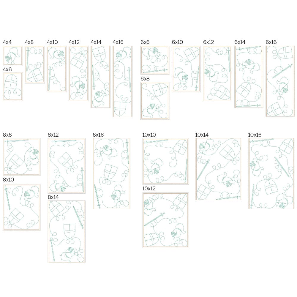 Again, your purchase of the large-scale Mythic 5 design includes 44 file sizes: 22 files for the Clear Blue Tiles quilting method and 22 files for the Block-by-Block quilting method. These large-scale design files fit within machine embroidery hoop sizes 4×4 to 10×16!