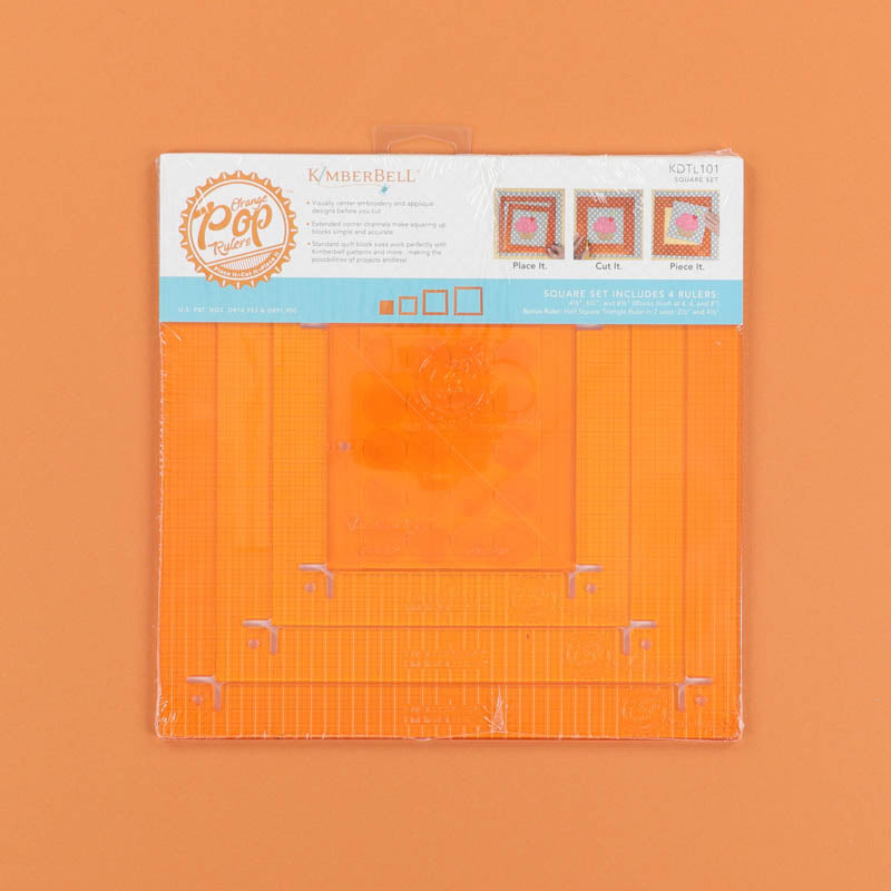 Orange Pop Rulers® make squaring up quilt blocks simple and accurate! The open frame allows you to see the block, making it very easy to visually center embroidery applique designs before you cut. Rulers are standard block sizes, feature extended channels for perfectly square corners, and come with a variety of bonus rulers!