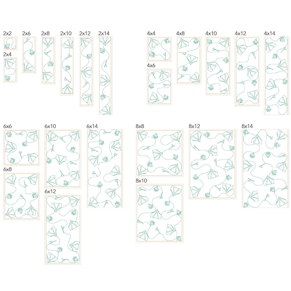 Again, your purchase of Outdoors 2 includes 44 file sizes: 22 files for the Clear Blue Tiles ® quilting method and 22 files for the Block-by-Block quilting method. Files will fit within any size of machine embroidery hoop, from 4×4 up to 9×14!