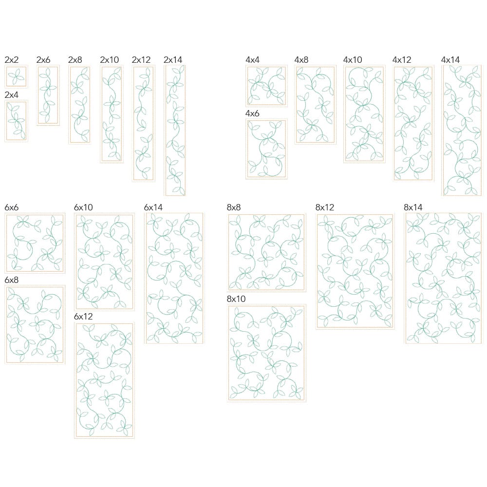 Again, your purchase of Plant 9 includes 44 file sizes: 22 files for the Clear Blue Tiles ® quilting method and 22 files for the Block-by-Block quilting method. Files will fit within any size of machine embroidery hoop, from 4×4 up to 9×14!