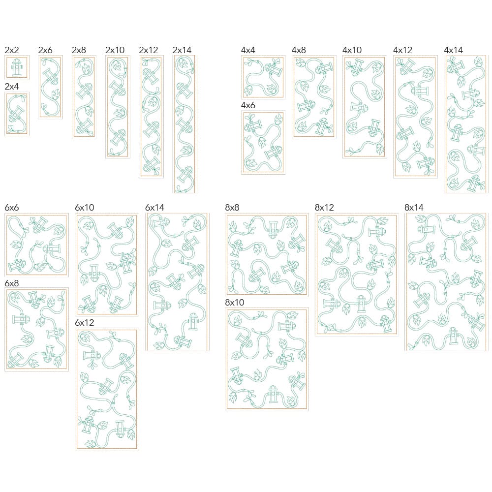 Again, your purchase of Safety 1 includes 44 file sizes: 22 files for the Clear Blue Tiles ® quilting method and 22 files for the Block-by-Block quilting method. Files will fit within any size of machine embroidery hoop, from 4×4 up to 9×14!