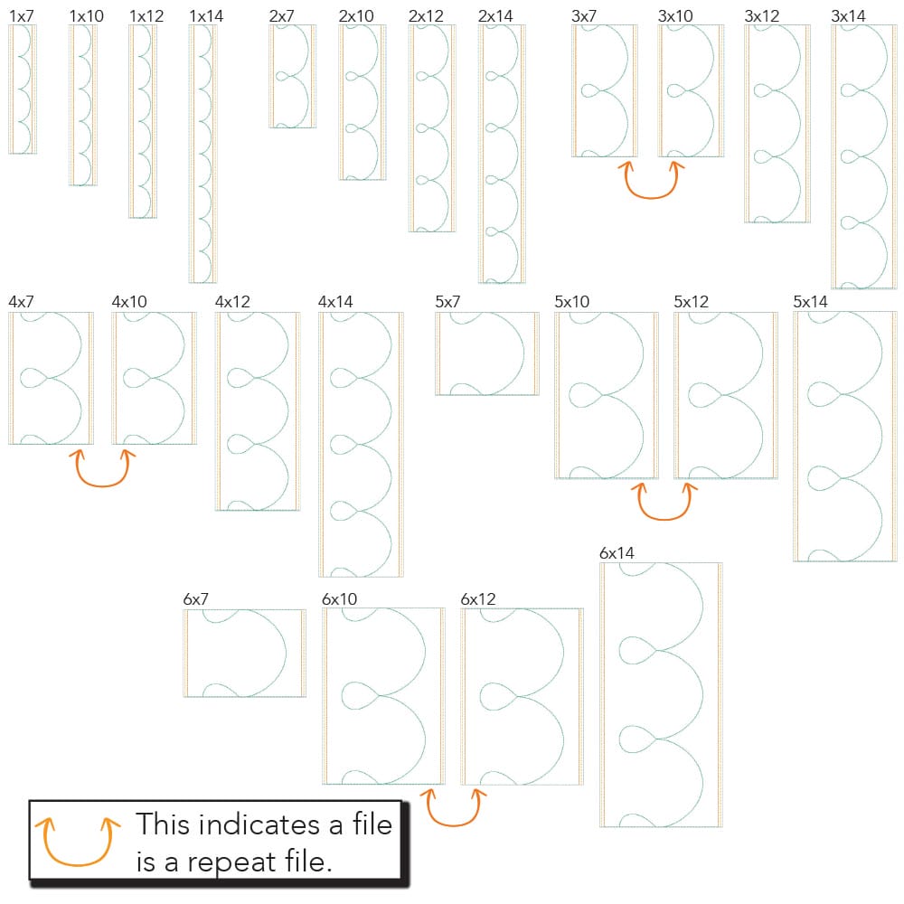Again, your purchase of Scallop Border 1 includes 24 file sizes for the Block-by-Block quilting method, including 4 repeat files. Files will fit within any size of machine embroidery hoop from 5×7 up to 9×14!