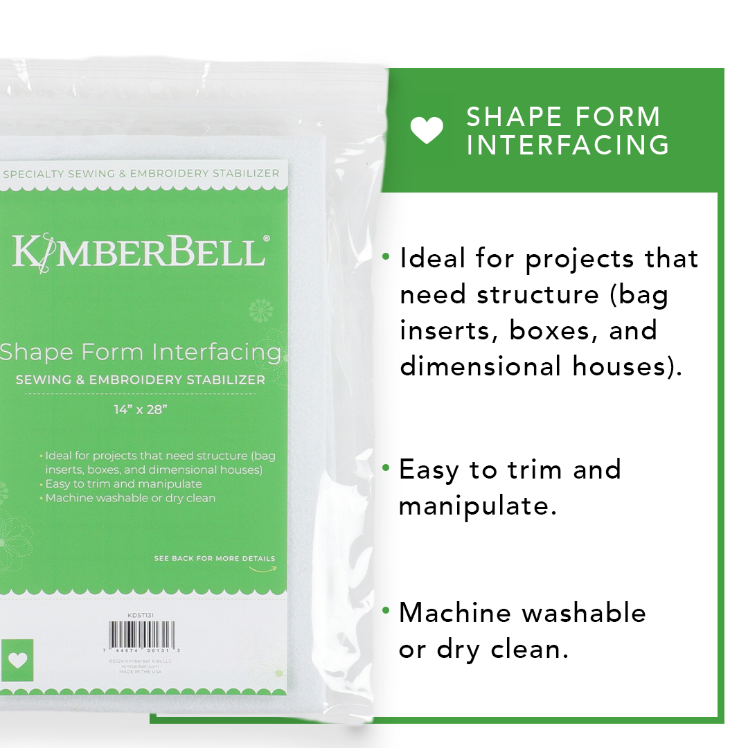 Create boxes, hat rims, 3D houses, and more with Kimberbell Shape Form Interfacing! Thick enough for sturdiness, yet thin enough to stitch on sewing and embroidery machines, Shape Form is easy to trim and manipulate. Use with other stabilizers (as per specific project instructions), then fold into desired shape!